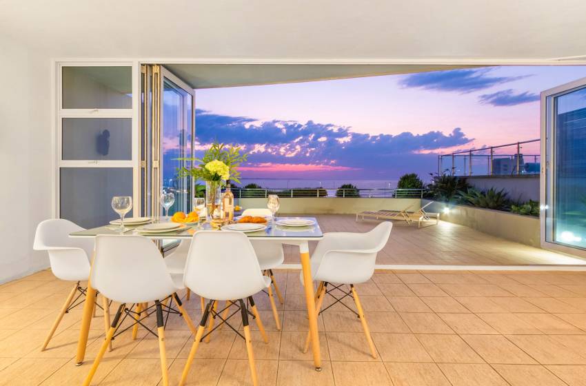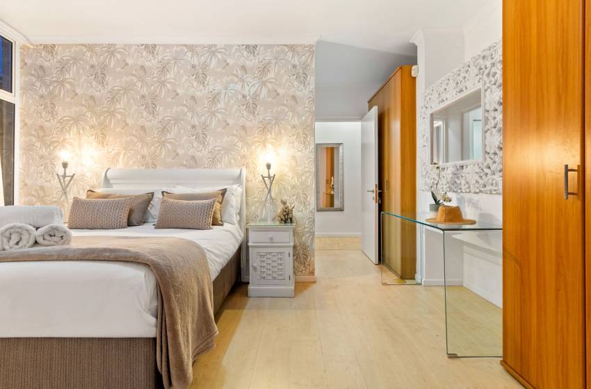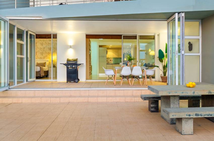 The main living area has a rustic elegance thanks to the large white face brick wall lining one side. The apartment has an open-plan fully-equipped kitchen and spacious lounge in soothing natural tones with a flat-screen TV and DSTV. The main living area leads to a sun lounge with a 4-seater dining table. Glass stacking doors that open fully lead onto the large private balcony with loungers, a casual dining area and exceptional ocean views - perfect for entertaining or simply enjoying a Cape Town sunset.
