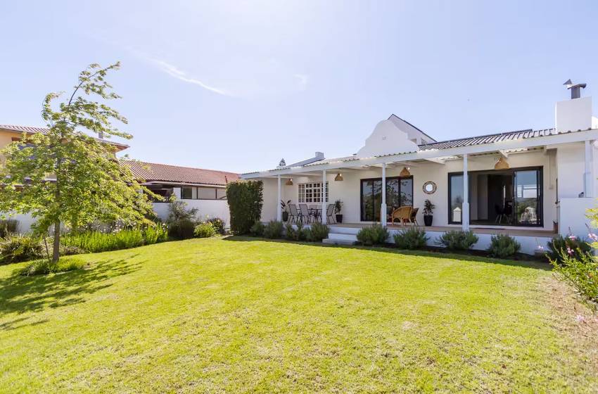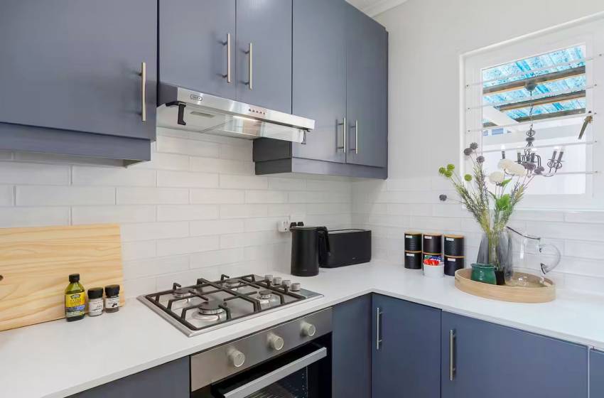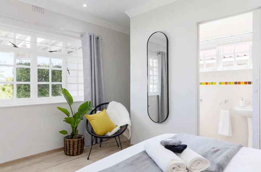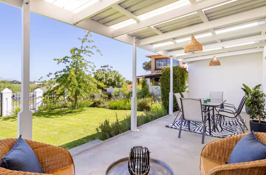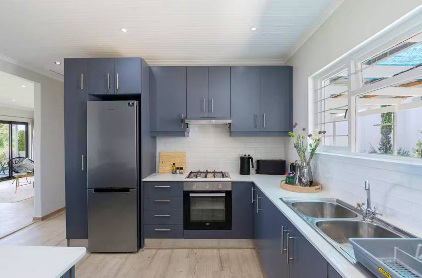 Guests will appreciate the spacious kitchen that’s fully equipped for a self-catering stay. The walls are lined with a white tile backsplash that perfectly complements the sleek-styled counters and cabinets, giving the kitchen a modern feel. Air conditioning can be found throughout the property, assuring that the space stays nice and cool during the Western Cape’s hot summer temperatures.