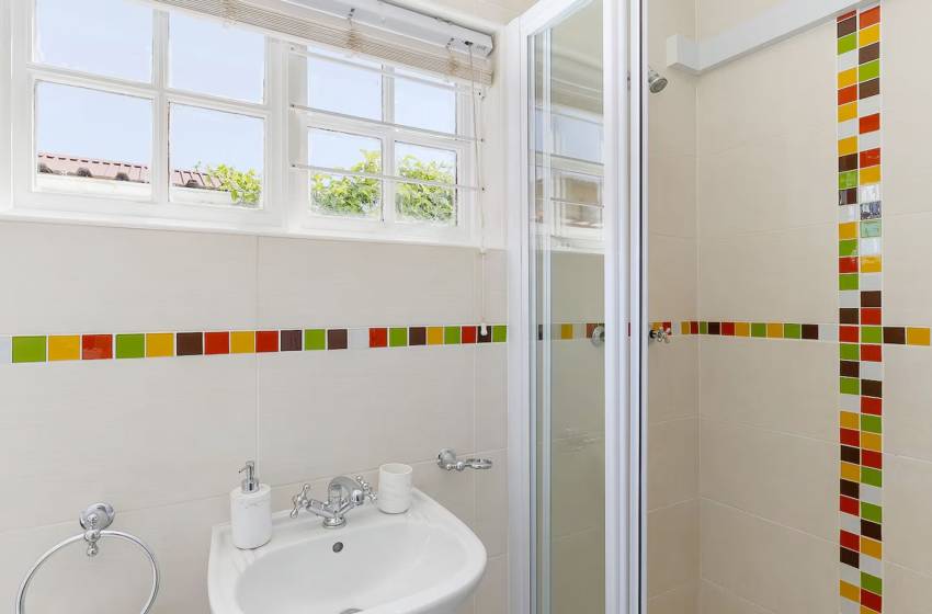 This property features three bedrooms and can comfortably welcome up to five guests. The main bedroom has a double bed with nightstands placed on both sides. This spacious, airy room also features an en-suite bathroom. This bathroom contains a shower, washbasin, and toilet. The second bedroom also has a double bed and features a window that looks out over the backyard. The third bedroom has a single bed, as well as a large wardrobe that provides ample storage space. The second bathroom has a bathtub, shower, washbasin, and toilet.
