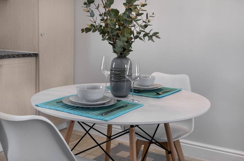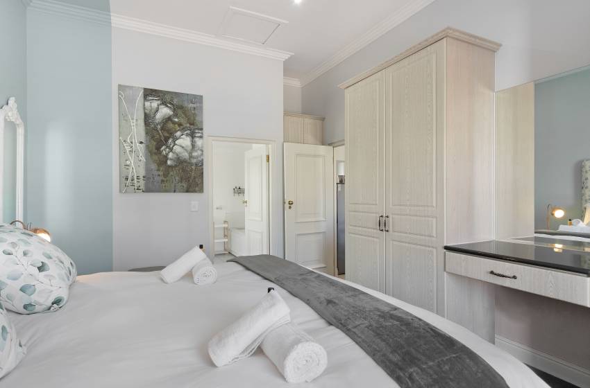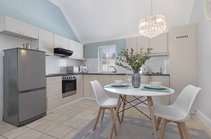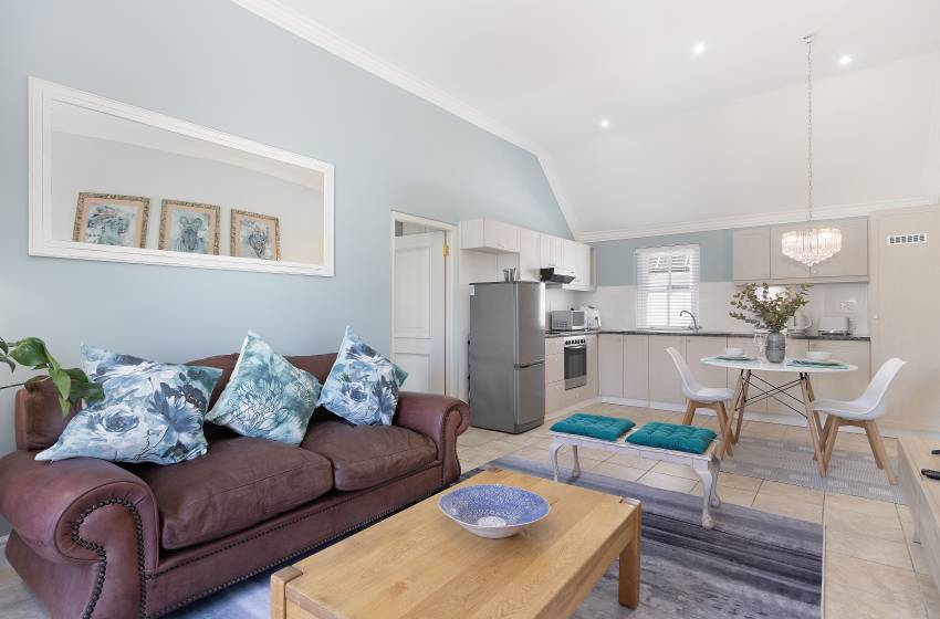 This single-bedroom holiday apartment is sleek and stylish. The kitchen area comes kitted with all the essential appliances, cupboard storage, and working space; ensuring a comfortable stay from the moment you step foot inside. The kitchen leads into the open-plan dining/living area, with a dining suite accommodating up to four guests. The living area is roomy with an assortment of classy furniture, décor, and a flat-screen TV with access to DSTV services. The luscious balcony area hosts an outdoor dining suite, where the sunset can be enjoyed over a good bottle of wine.