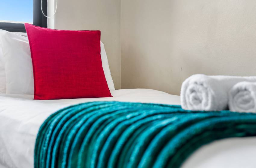 The master bedroom has a king bed, a wall-length floor to ceiling window and ample cupboard space for the fashion-loving traveller, while the second bedroom has 2 x single beds. The apartment has 2 bathrooms - one features a bathtub, shower, toilet and single sink, while the other has a shower, toilet and single sink.