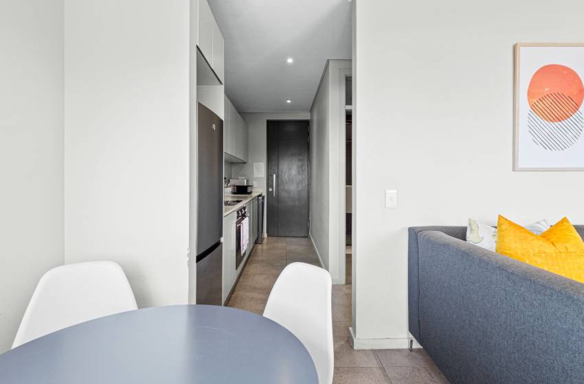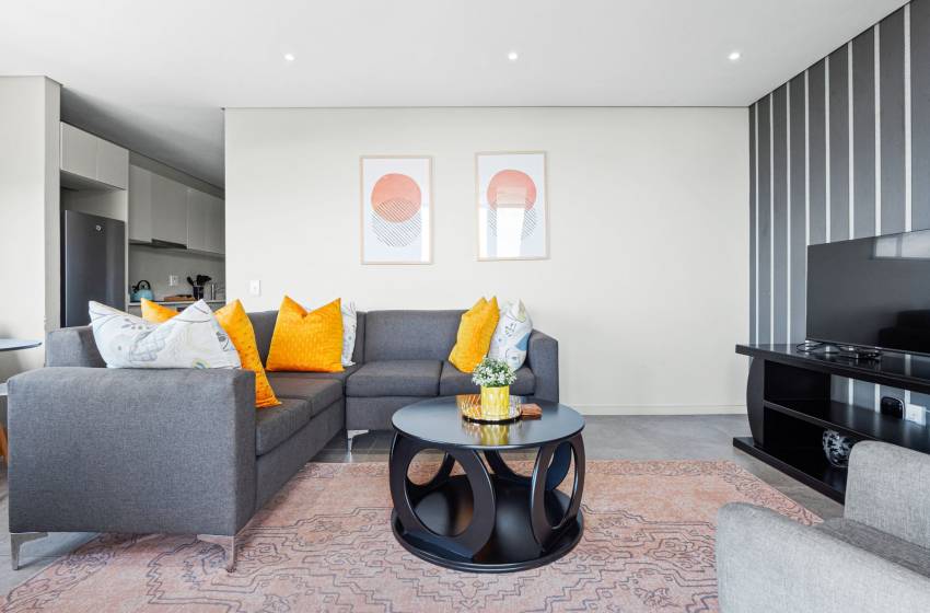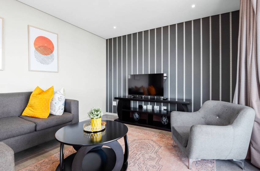 The open-plan living space offers a chic, round dining table and chairs, perfect for a more intimate dining experience. The stylish wall décor adds to the space's warm and welcoming atmosphere. The lounge is thoughtfully furnished with soft couches, a sleek coffee table adorned with minimalist décor and a flatscreen television, the ideal spot to relax and enjoy your favourite TV programs.