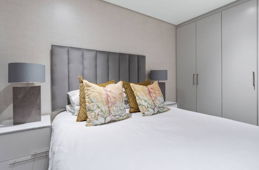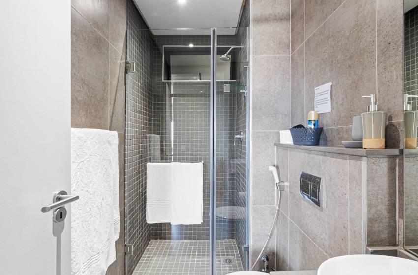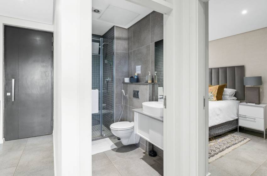 The modern bathroom is equipped with a toilet, a basin with a vanity and a spacious shower. The bedroom features a double-sized bed with decorative accent pillows, trendy, elegant lighting on both nightstands and sufficient wardrobe space in the built-in closet.