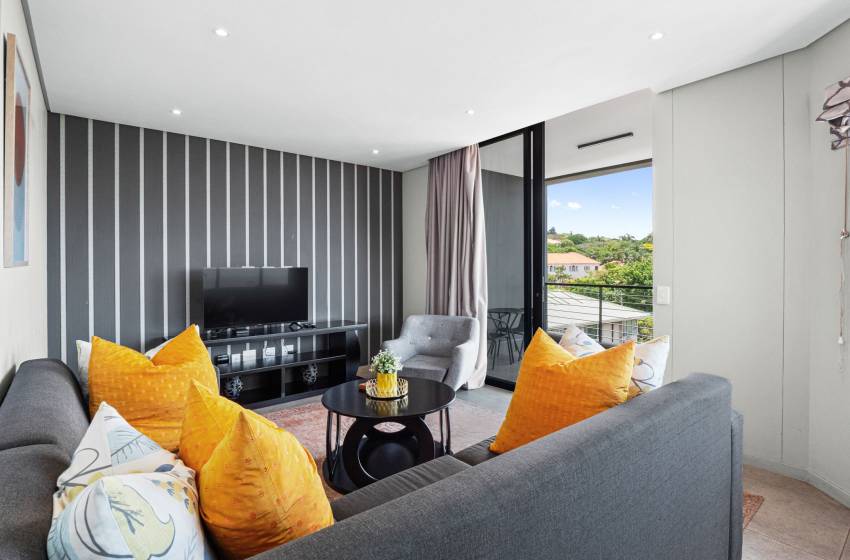 Access your own private balcony through the glass sliding door, furnished with an outdoor dining set, creating a tranquil space to take in the fresh air while admiring Morningside's stunning sea and city views. Additional features include secure parking within a remote-control access complex, access to a shared outdoor pool, concierge services, self-service laundry, internet access as well as linen and towels included in your stay.