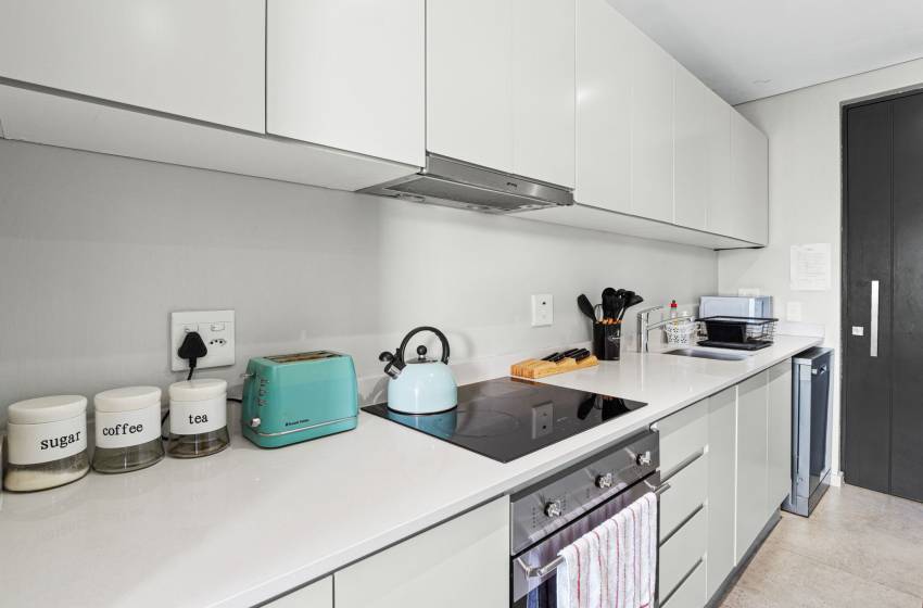 Upon entering this stylish, one-bedroom apartment, you'll be presented with the gorgeously sleek and modern kitchen with soft-close cabinets that add ease and elegance. The kitchen is fully equipped for all your culinary needs and includes a dishwasher for convenience and practicality during your stay.