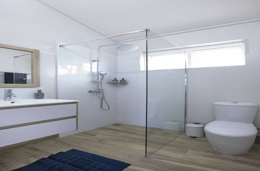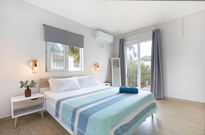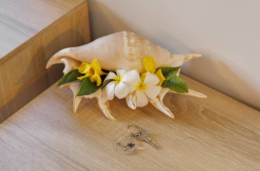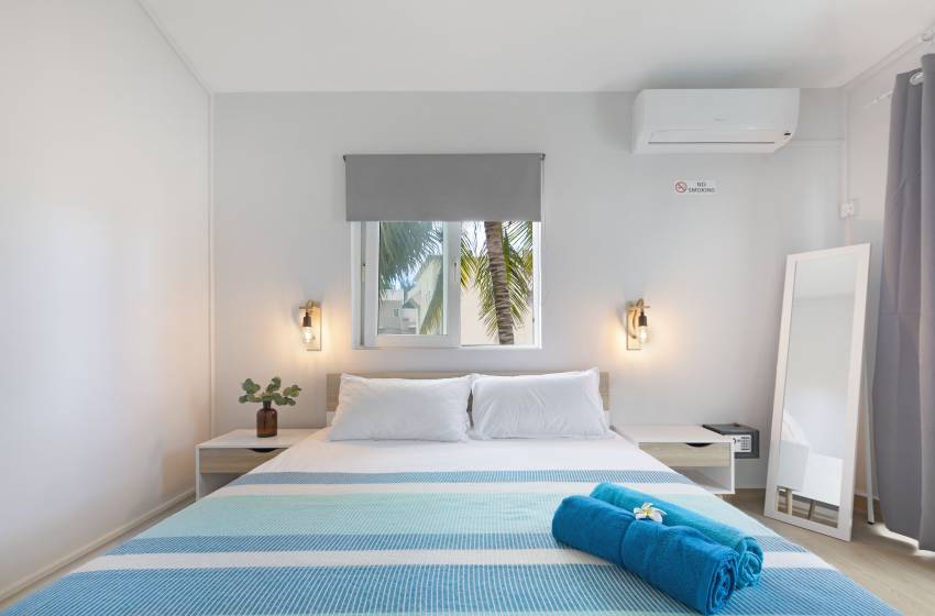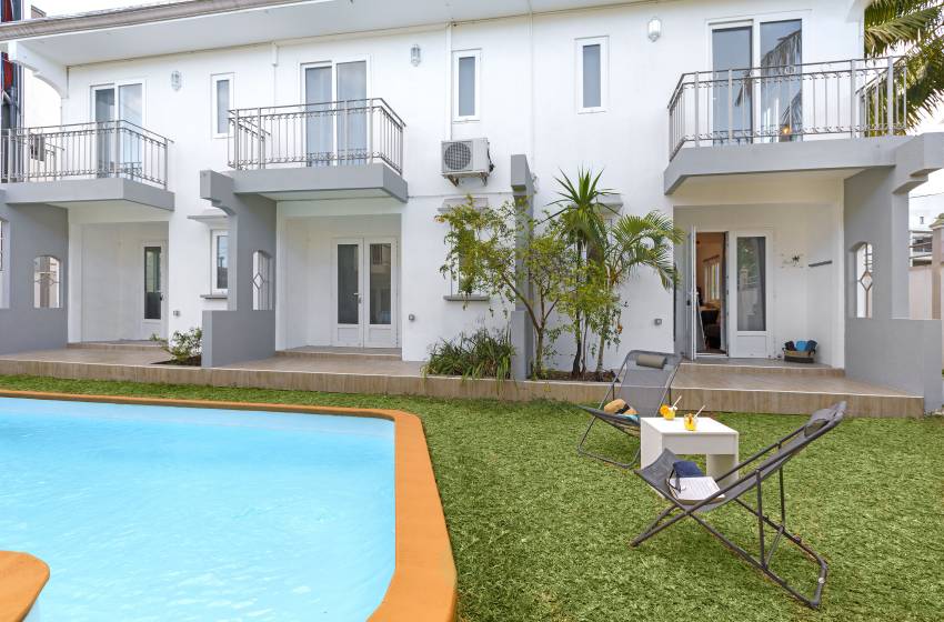The apartment has an open-plan fully-equipped kitchen and spacious lounge in soothing natural tones with a flat-screen TV. The main living area leads to a 4-seater dining table. The unit leads onto the large shared garden with loungers and a swimming pool - perfect for entertaining or simply enjoying a Mauritius sunset.