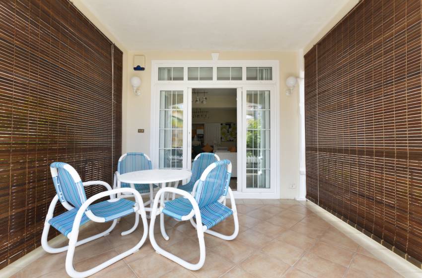 The spacious living area consists of a fully equipped kitchen including a dishwasher and coffee machine for your convenience. The open plan design of the lounge and dining area is perfect for a more intimate setting with the dining area comfortably seating 6 people and the lounge including a flat screen TV for some relaxed down time after a long day. The lounge area leads out onto a stunning undercover balcony with outdoor furniture which overlooks the sparkling shared swimming pool for guests to make use of as they please.