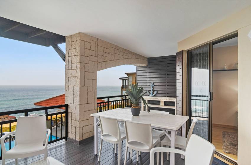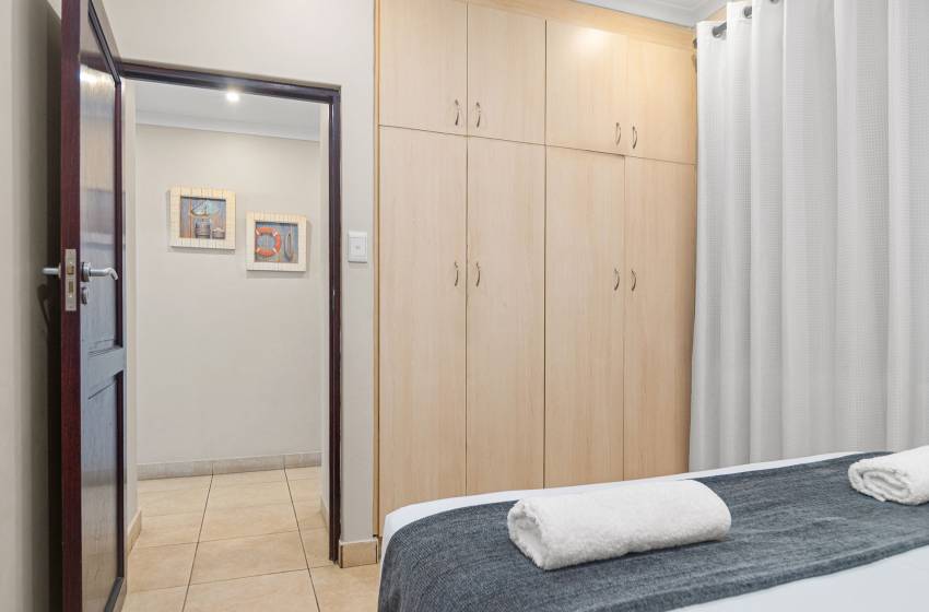 The kitchen is fully fitted with everything you need to enjoy a relaxing self-catering experience. The lounge features an open-plan design, creating a spacious and inviting atmosphere. The space is thoughtfully furnished with plush couches and a TV cabinet with a mounted flat-screen television for your entertainment, as well as WiFi throughout the property. Large sliding doors open to the balcony overlooking the swimming pool and ocean, the perfect spot to unwind.