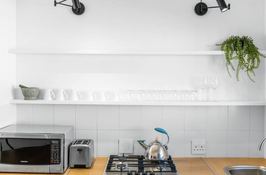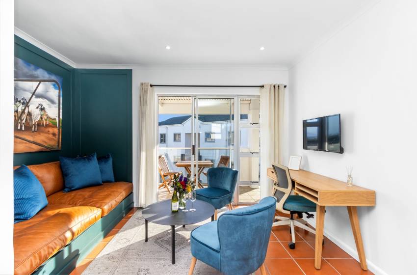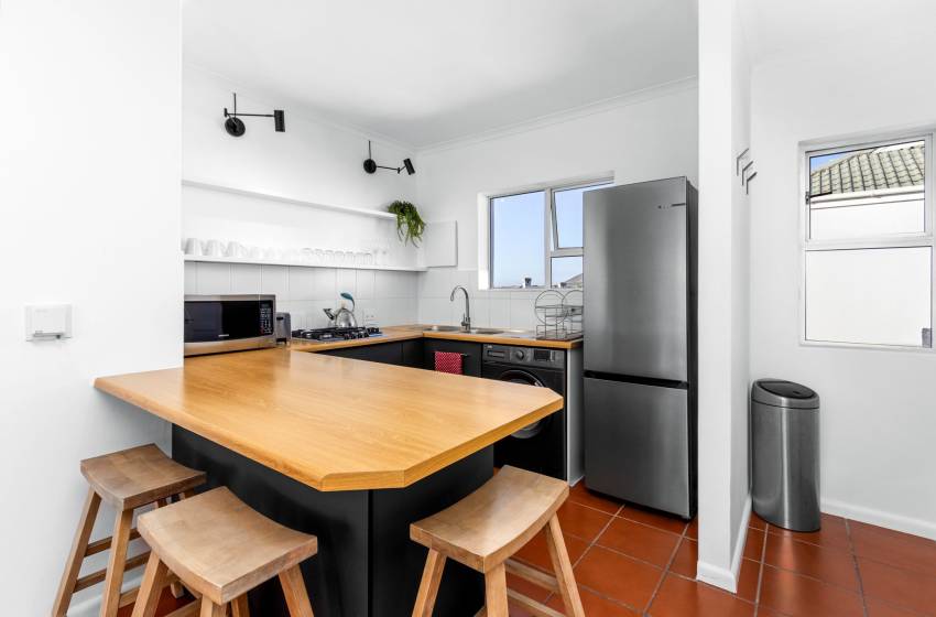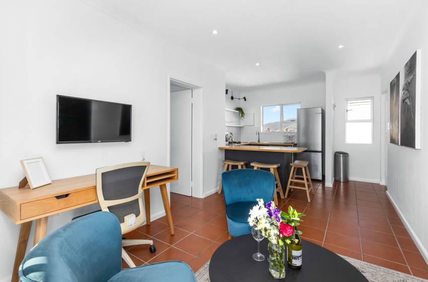 As you enter this well-appointed apartment, you’ll be welcomed with the modern and very inviting open plan living space, which offers a kitchen with basic necessities, including a washing machine, a cozy yet stunning lounge area that includes a couch, flat screen TV and even a desk creating a small study space. Leading out from the lounge is a sizeable balcony with outdoor furniture where you can sit for hours taking in the views of the nature reserve, ocean and mountain, even the sunsets from this spot will blow you away.