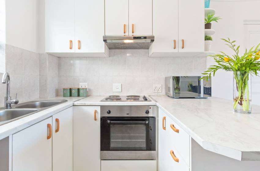 The moment you step into the apartment, you are welcomed by the open-plan design of the space. The kitchen is spacious and fitted with everything you need for a relaxing self-catering holiday.