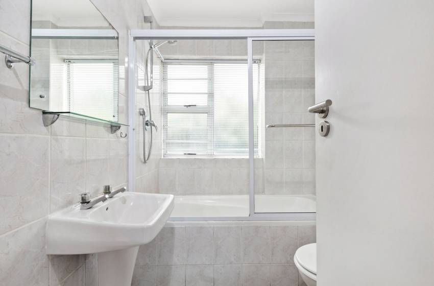 The main bedroom contains a double bed, while there are two single beds in the second bedroom. The well-appointed bathroom features a shower-bath combo, a washbasin with vanity, and a toilet.