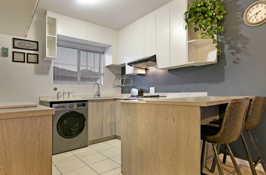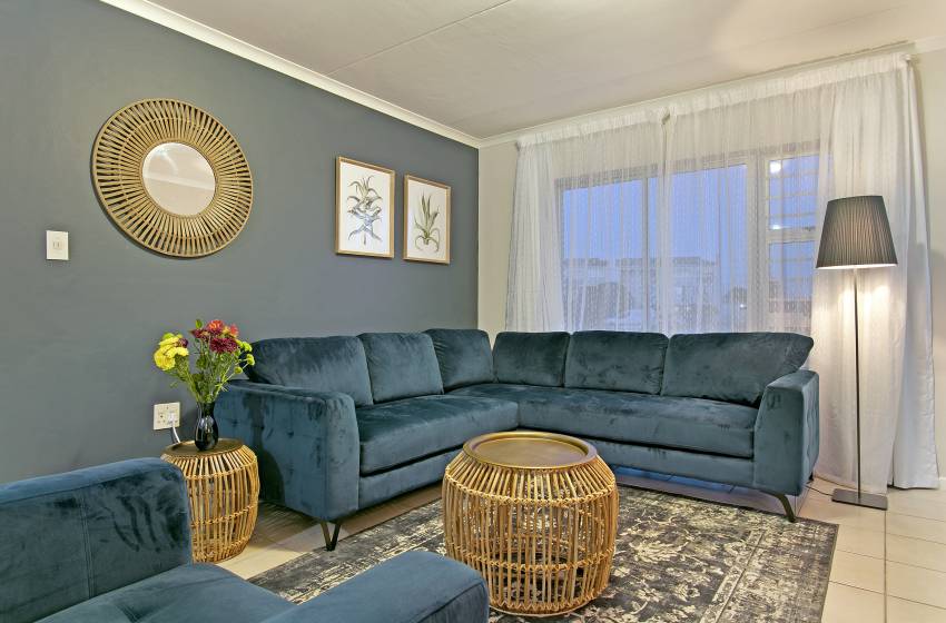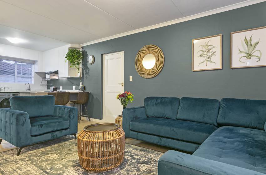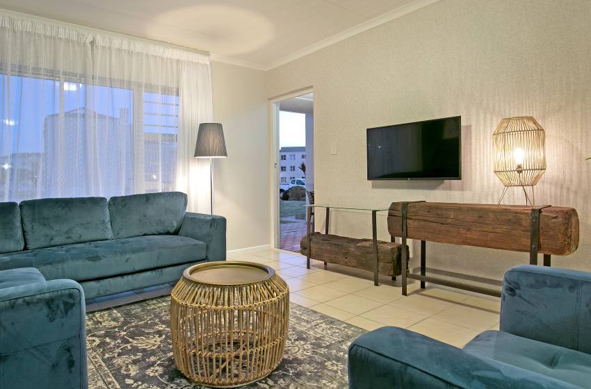 The kitchen of this cosy apartment is well-equipped for your self-catering stay, while the lounge is luxuriously furnished for complete relaxation. This apartment also includes an outdoor patio area, perfect for dining, along with access to the complex’s communal braai facilities.