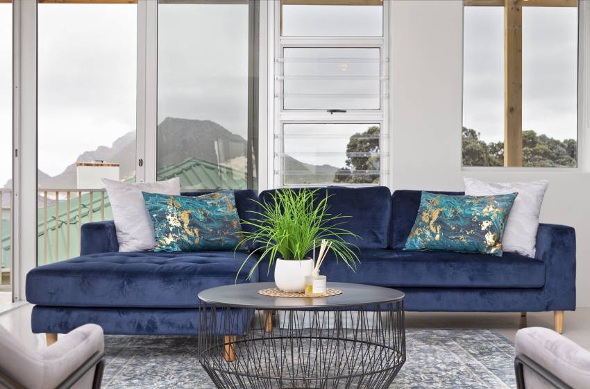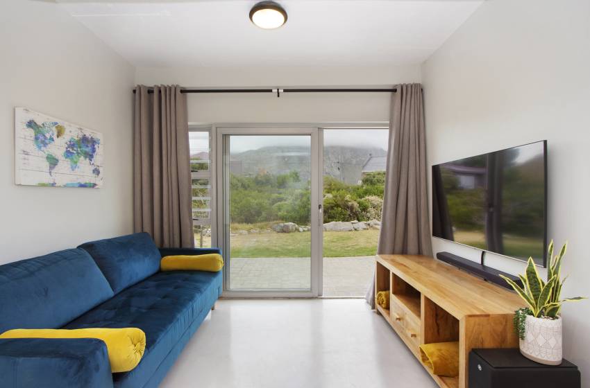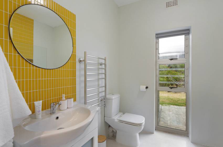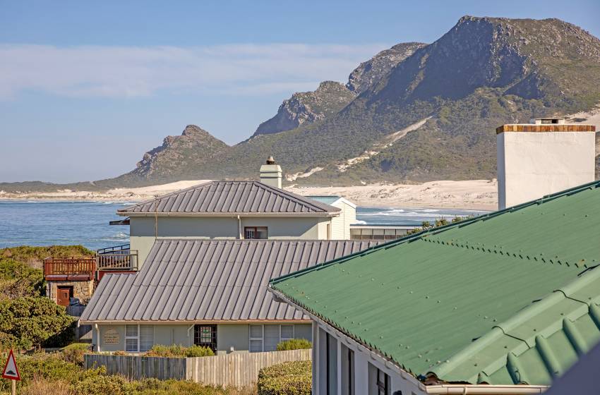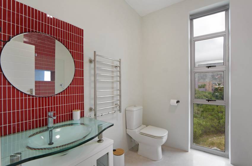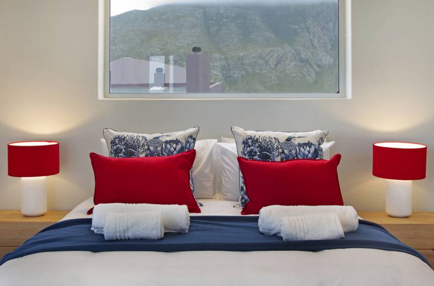 The interior is designed to complement the natural surroundings, with each space individually designed to perfection with colour, space and modern finishes. The house has an inverter, and backup battery, for its two levels with five bedrooms, providing ample space for family or friends to enjoy. The lounge and kitchen on the top floor open into a stylish open-plan space leading to a neat and refreshing balcony with stunning sea views. Upstairs, the main bedroom is open plan with an en-suite bathroom straight out of a luxury home magazine. A further two bedrooms upstairs are artfully laid out to give a sense of tranquillity and connection to nature through an abundance of light and sea or mountain views. The two downstairs bedrooms are also beautifully furnished and open into an open plan living area and balcony with sea views and an indigenous fynbos garden.