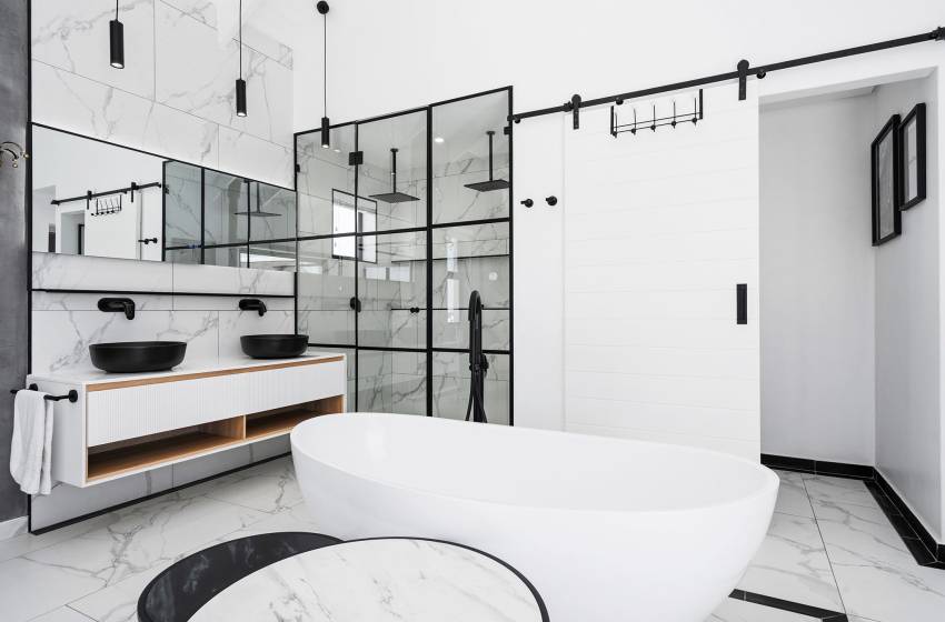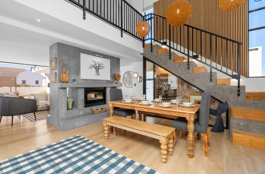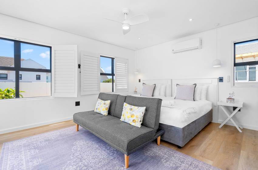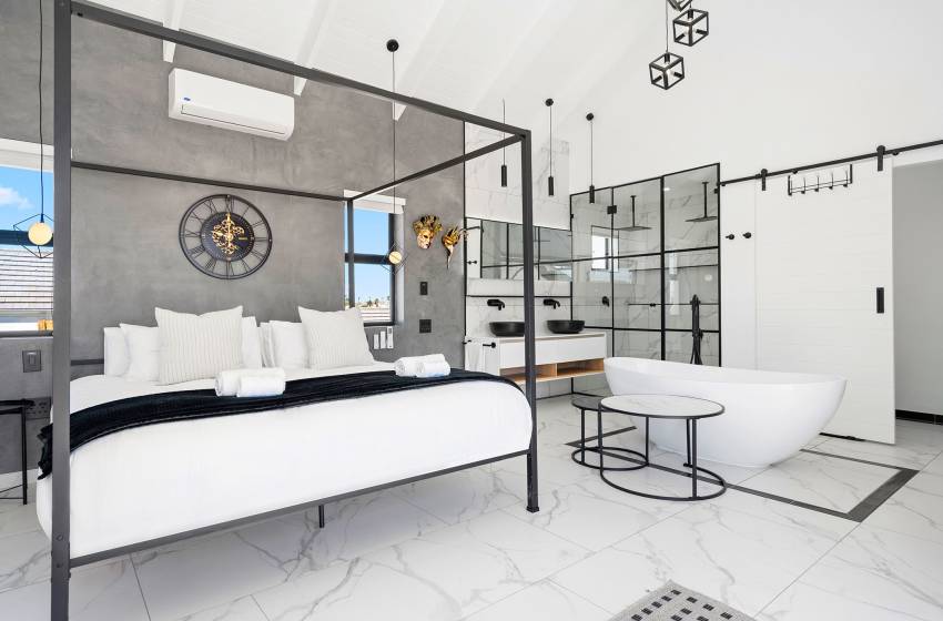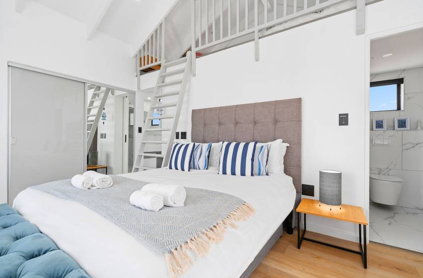 One of the four beautiful ensuite bedrooms is located downstairs, with two ¾ beds and has direct access to the private garden and outdoor patio through sliding doors. All four bedrooms have spectacular sea views, air conditioning, ceiling fans and private outdoor patio access. A stunningly designed staircase guides guests to the second floor, which houses the remaining three ensuite bedrooms. The master bedroom boasts a king-size bed, an indoor fireplace and a seamless open-plan design with a free-standing bath, double basin and double “his and hers” shower, all integrated within the bedroom but with a private ensuite toilet. The remaining two bedrooms each feature a queen-size bed. One of these rooms also includes a loft-style space, accessible via a sturdy ladder within the bedroom. This cozy elevated hideaway offers an additional queen and ¾ bed. With its low ceiling, it’s an ideal space for children, offering a whimsical and playful semi-private retreat just for them.