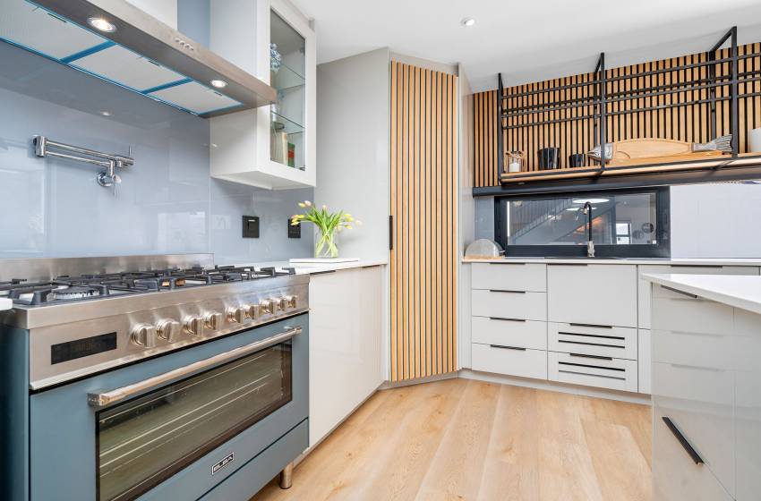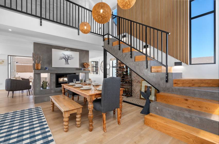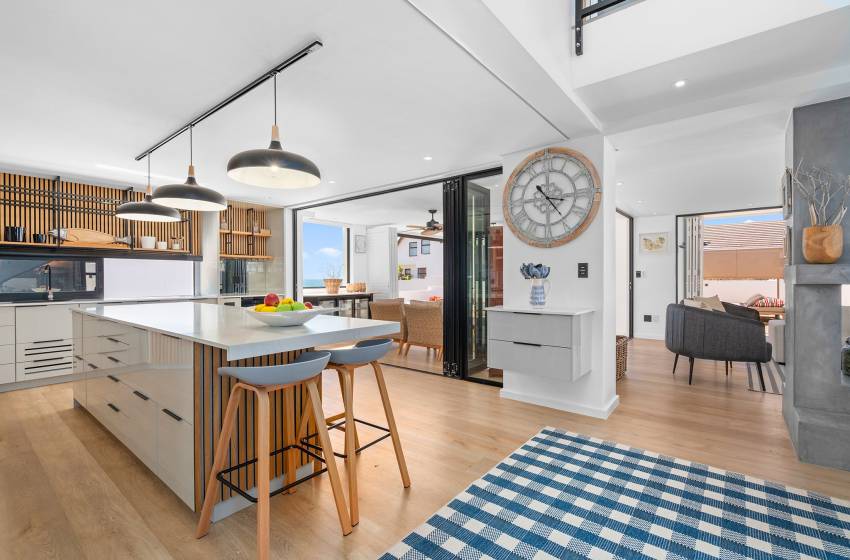 An inviting double sided, wood-burning fireplace separates the dining room from the tranquil lounge area, fitted with a smart TV, creating the ideal place to relax and unwind. Adjacent to the lounge is an enclosed patio or entertainment area with stackable seamless glass doors ,allowing an abundance of fresh air and natural light to fill the room. This area has an indoor wood barbeque/braai, making this the perfect spot to enjoy social gatherings, board games, sudoku or puzzles. There are also multiple cosy reading nooks with beautiful sea views throughout this home which offer the perfect space to unwind with a book. For added convenience, there is a guest toilet within the living space.