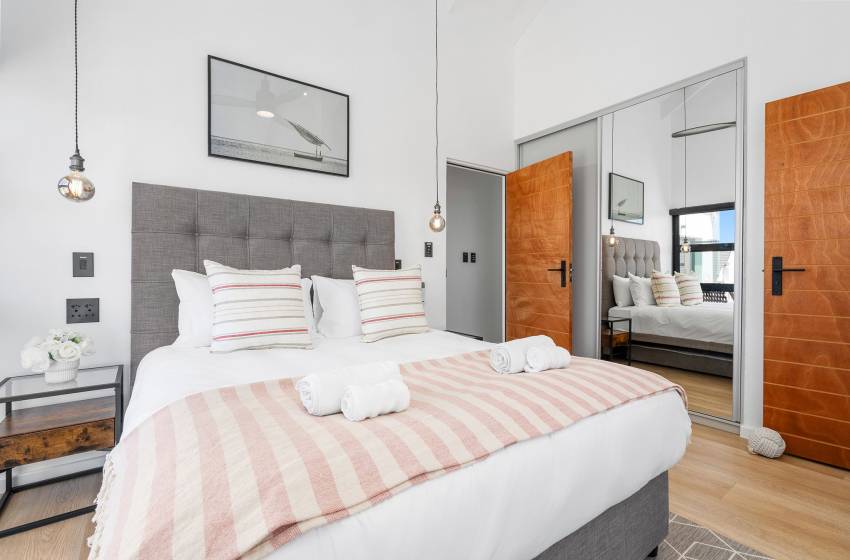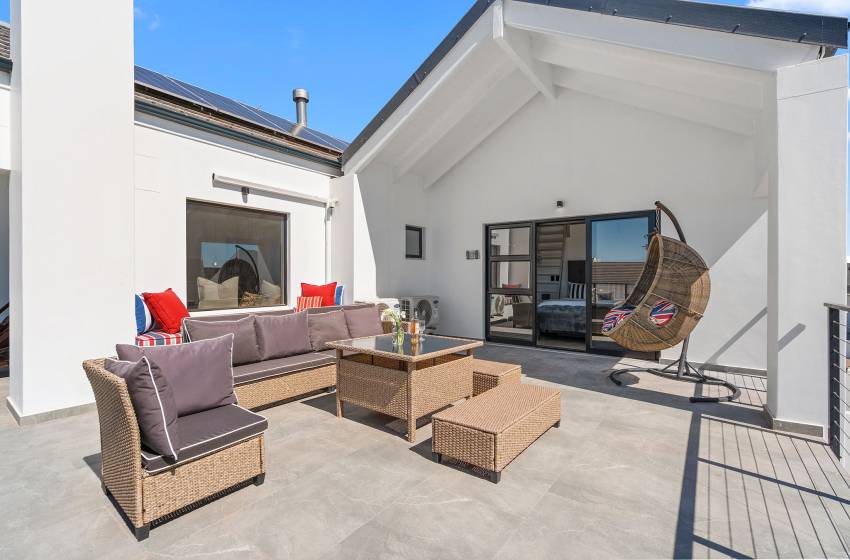 The private garden boasts ocean views, a sparkling heated swimming pool, six sun loungers and a luxurious double day bed, allowing guests to make the most of those hot summer days. An open upstairs patio is the perfect area to comfortably enjoy sundowners on the outdoor lounge furniture or swing chair while experiencing the most exquisite sunsets.