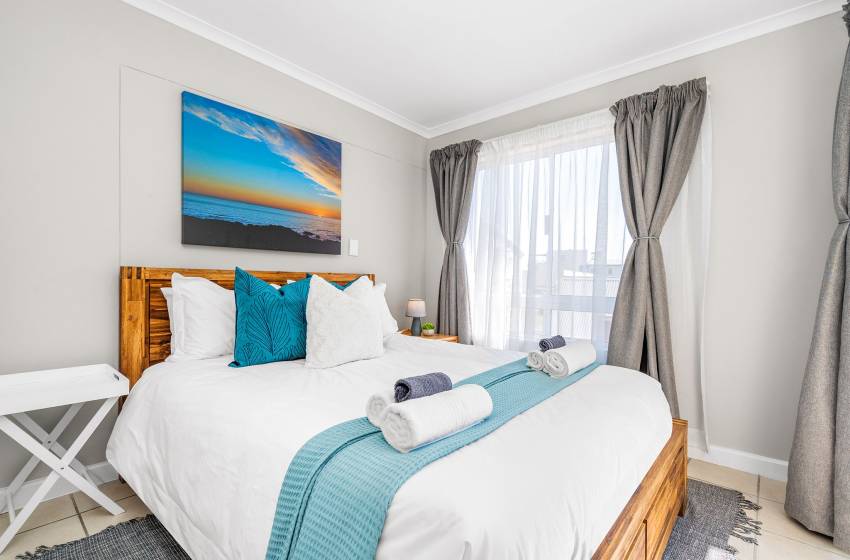 This is a thoughtfully designed two-bedroom, two-bathroom staycation that features a comfortable lounge and a balcony with a braai area for those perfect, relaxed evenings overlooking the trees and a soft sea view. Wi-Fi is available throughout the apartment.
