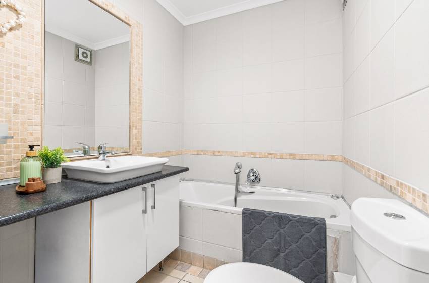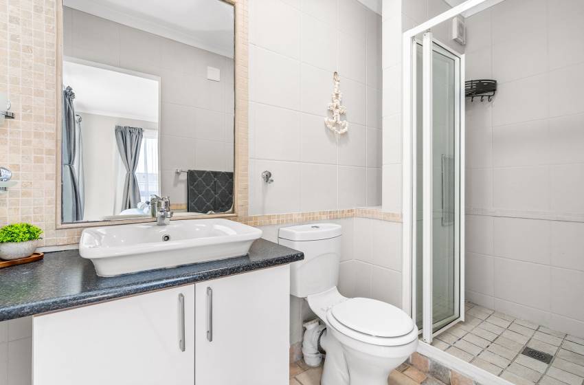 The main bedroom is fitted with a queen-sized bed, and the second bedroom features a bunk bed with a double bed on the bottom and a single bed on top. The first bathroom comprises a bathtub, a washbasin with vanity, a bathroom cabinet, and a toilet, while the second bathroom has a toilet and a shower. Linen and towels are included in your stay.
