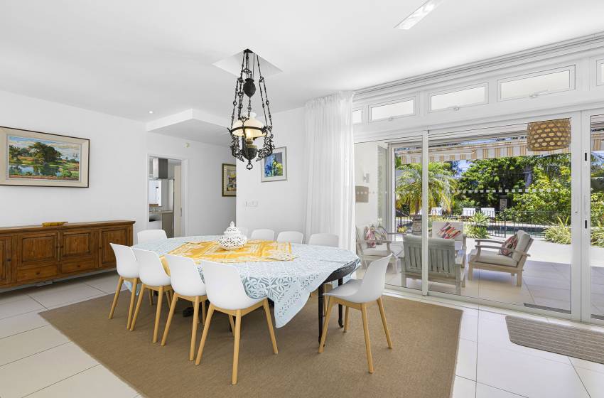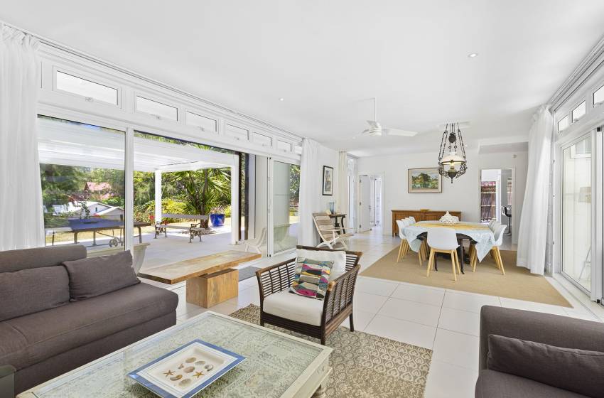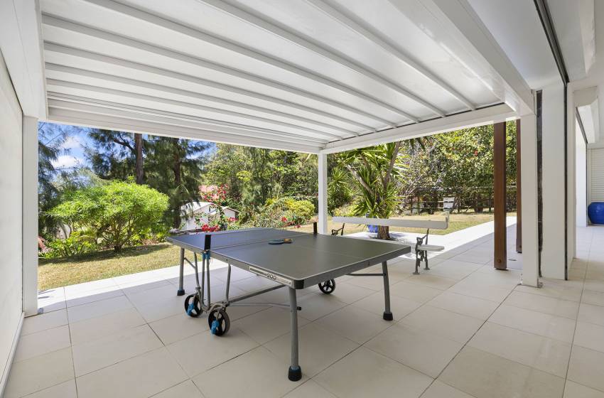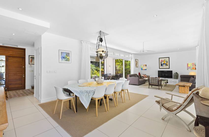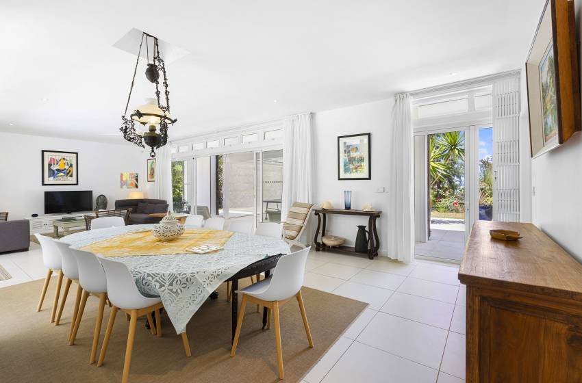 The property features a variety of dining spaces that cater to different preferences and occasions. Inside, guests can enjoy a beautifully designed dining space that offers a warm and inviting atmosphere, perfect for intimate dinners or family gatherings. Outside, the dining options expand to include a charming, covered terrace and a spacious deck, ideal for al fresco meals in a serene garden setting leading directly onto a sandy beach. Guests will have access to a tennis table, swimming pool, and barbecue facilities.