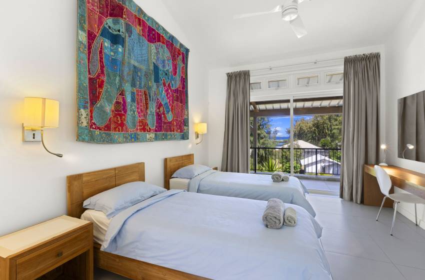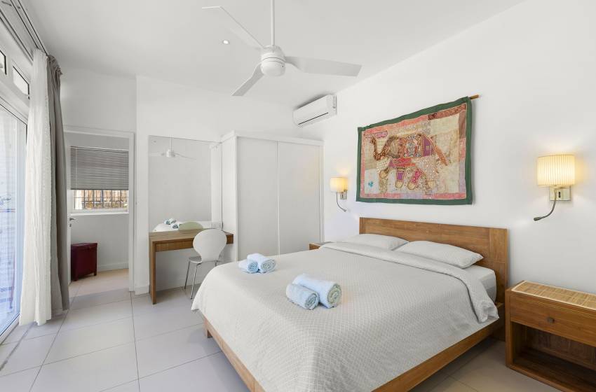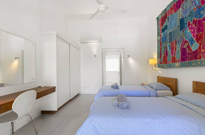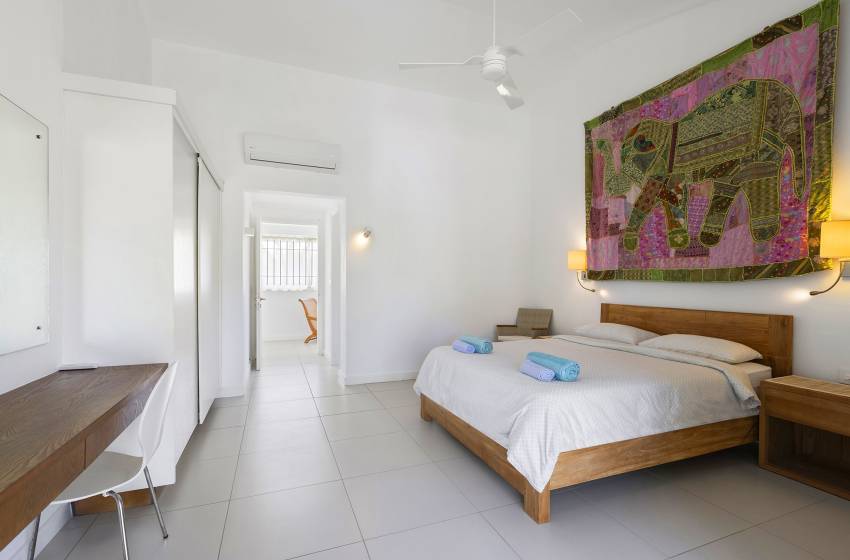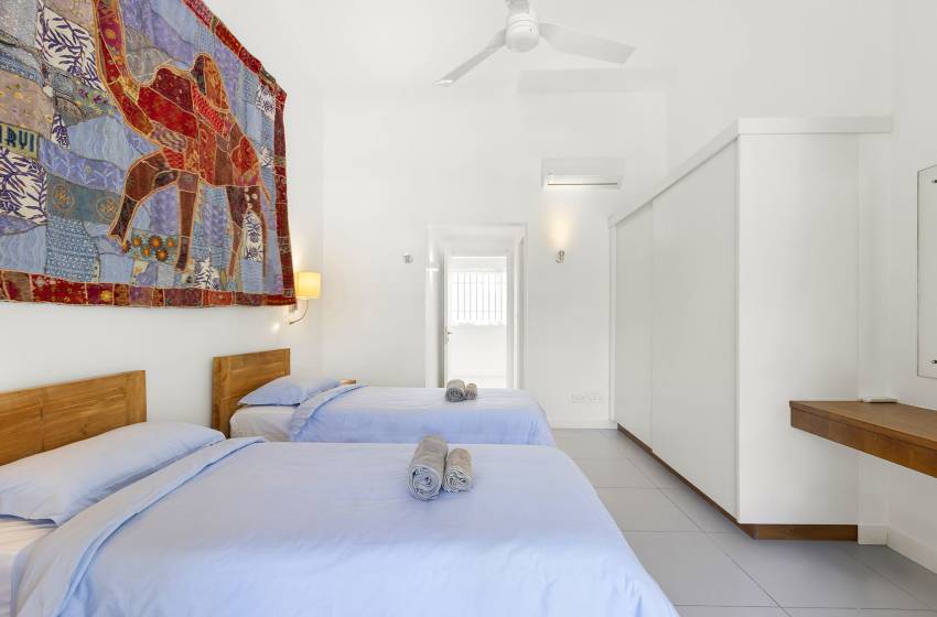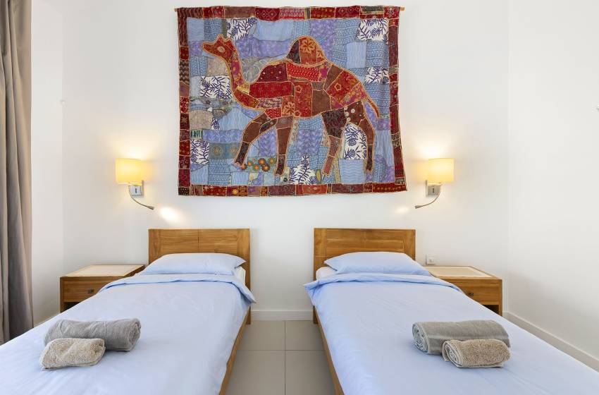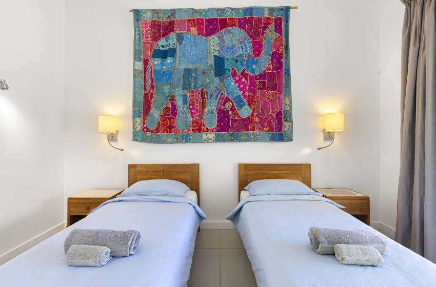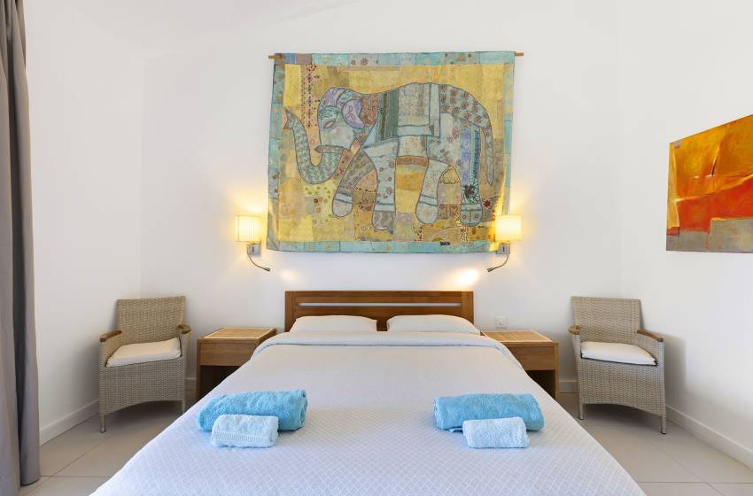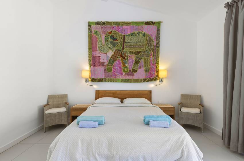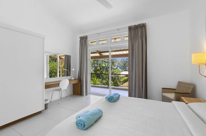 The villa has five spacious bedrooms, each with an en-suite bathroom and air conditioning. Three bedrooms are furnished with king-size beds, while the remaining two include single beds.
