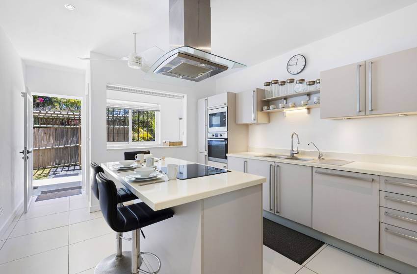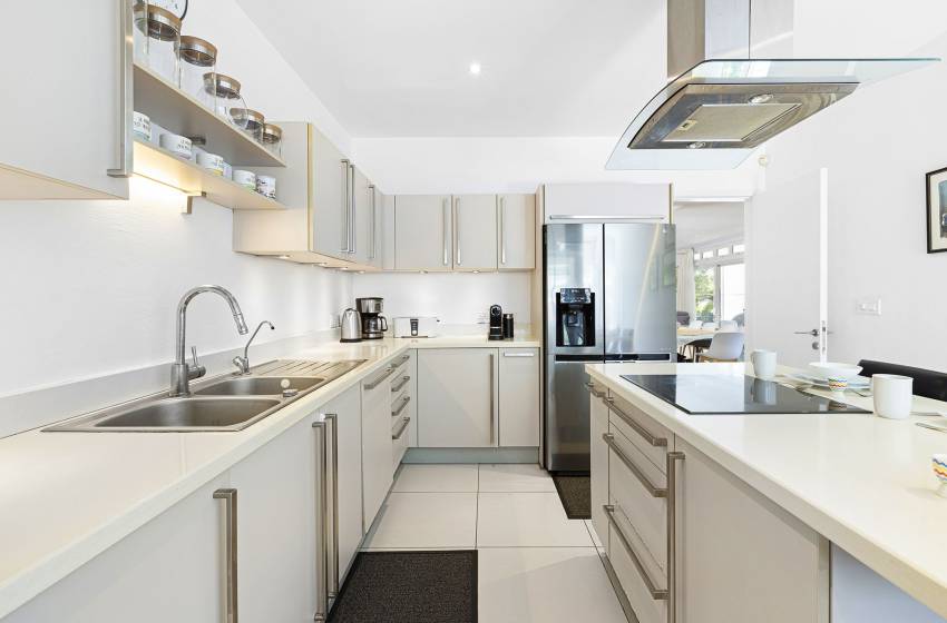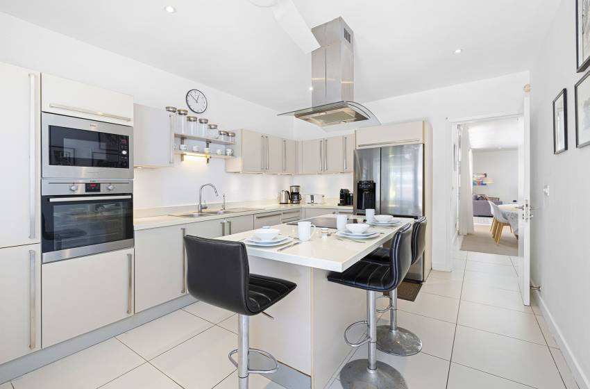 The kitchen is fully equipped with everything you need for a self-catering stay, including a dishwasher, washing machine, fridge with an ice and water dispenser, coffee machine, and freezer for added convenience.