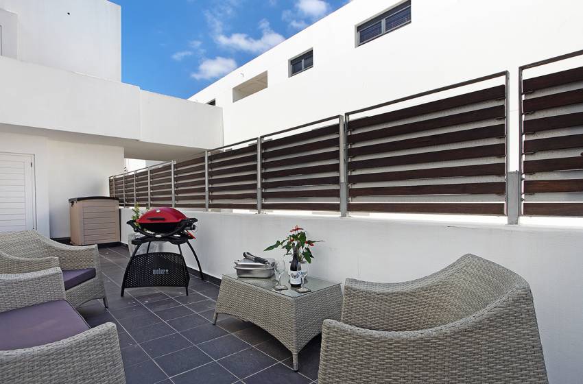 This stylish apartment provides all the must-haves for a comfortable experience. The bedroom comes with a double bed, an en-suite fitted with a shower and bath, and floor to ceiling windows for plenty of natural light. The main living area is open-plan and features a fully equipped kitchen with all amenities needed to whip up a delicious meal, a cosy dining area and a stylish lounge complemented by bold prints and bright touches and includes a flat-screen TV and Netflix. There is also an enclosed dining area outside with a gas braai to entertain guests.