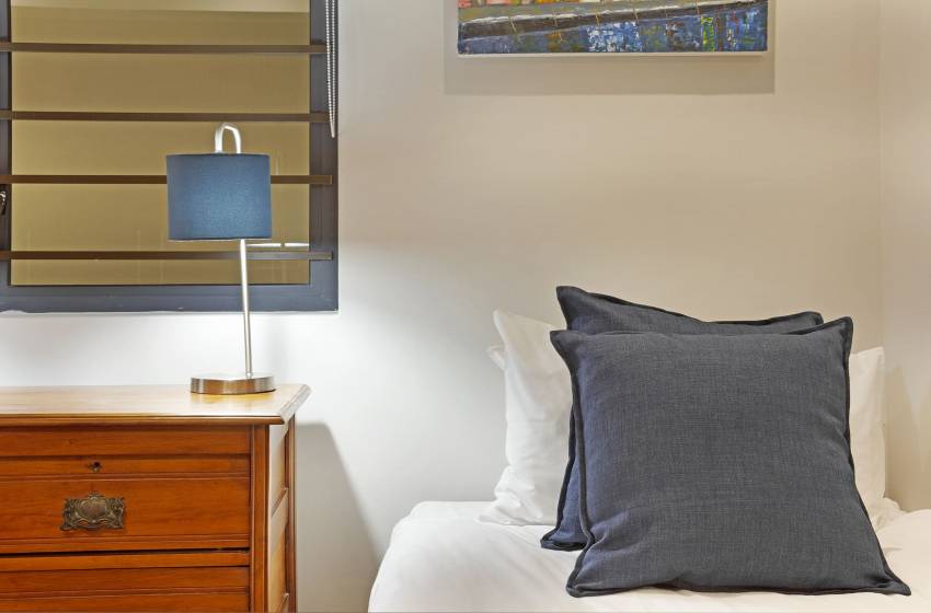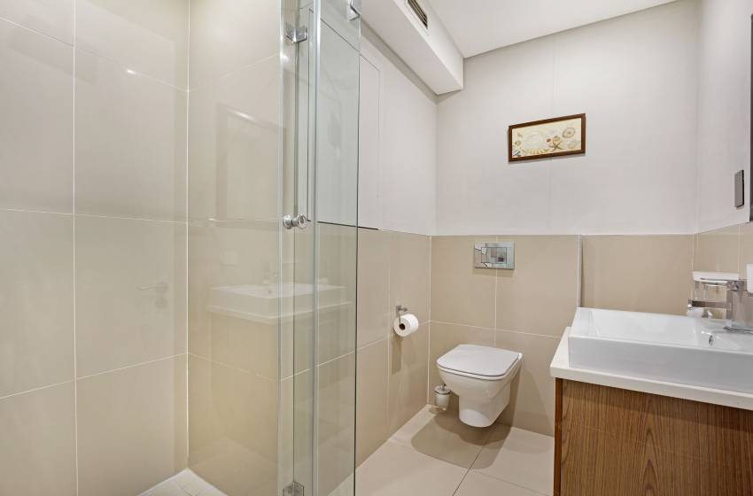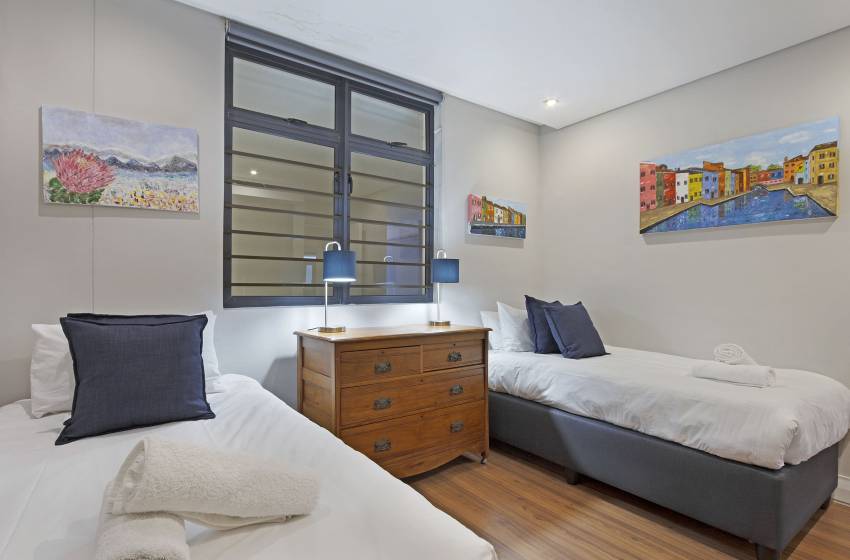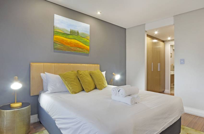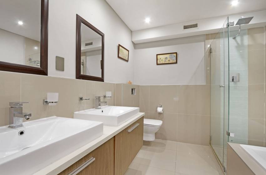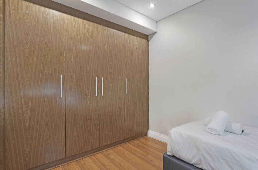 The apartment can comfortably sleep up to 5 guests, making it the perfect apartment for business travellers, friends or a family vacation. The main bedroom has a queen-size bed and a luxury en-suite bathroom featuring a bathtub, shower, his&her sinks and a heated towel rack. The second bedroom has two single beds, accessing the shared bathroom fitted with a shower. A sleeper couch in the lounge can accommodate an additional guest under 12 years old.