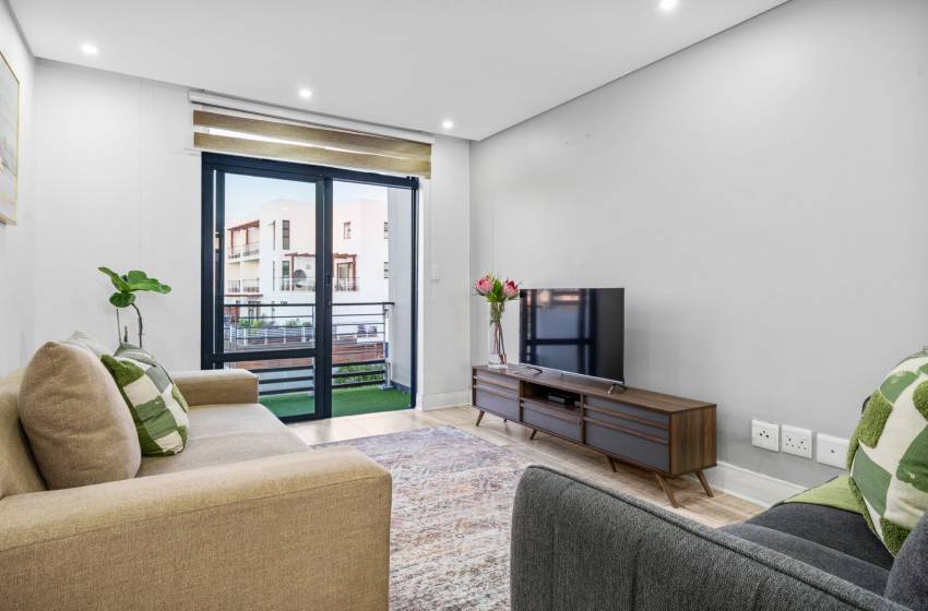 The apartment has an open plan kitchen and lounge complete with a rustic wood-like tile, a leather couch and stylish touches in soothing neutral shades. The kitchen is fully equipped for self-catering and includes a dishwasher, a washing machine and island seating for 4. The lounge features two sofas, WiFi, and an impressive flat-screen TV for relaxing nights bingeing your favourite series. A standout feature of this home is the balcony that boasts a gas braai/BBQ and a picnic bench - perfect for alfresco dining in good company. The unit has an inverter to enusre uniterrupted TV and internet access.