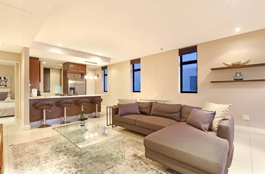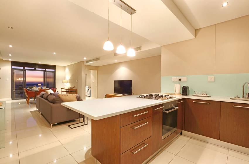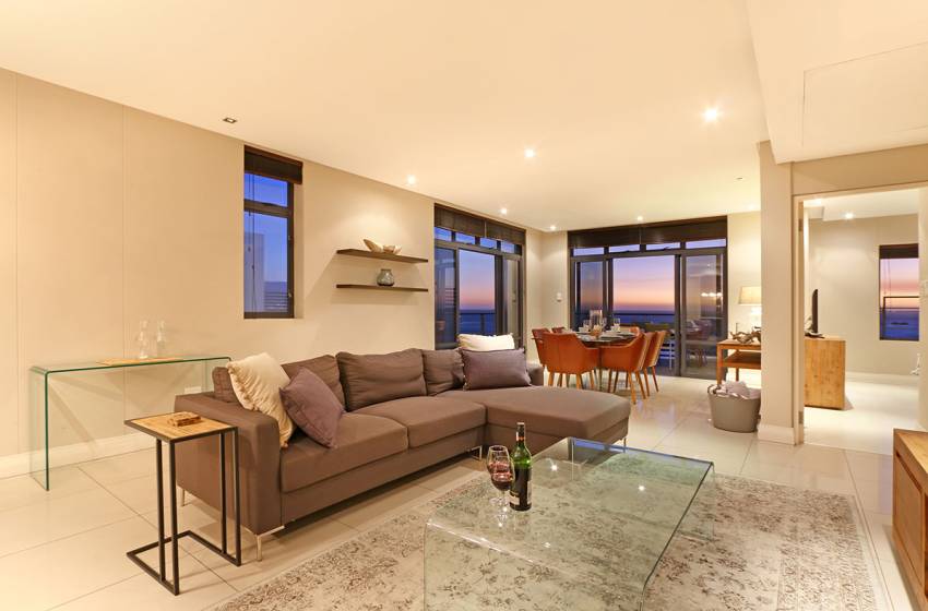 The luxuriously furnished lounge includes a flat-screen TV with Netflix leading to a furnished balcony complete with seating and an incredible view of Table Mountain and the Atlantic Ocean. The main bedroom has a queen bed, an en-suite bathroom with a bathtub and shower, and large windows for plenty of natural light and a view worth waking up for. The second bedroom has two single beds - perfect for children - and access to the shared bathroom fitted with a shower.