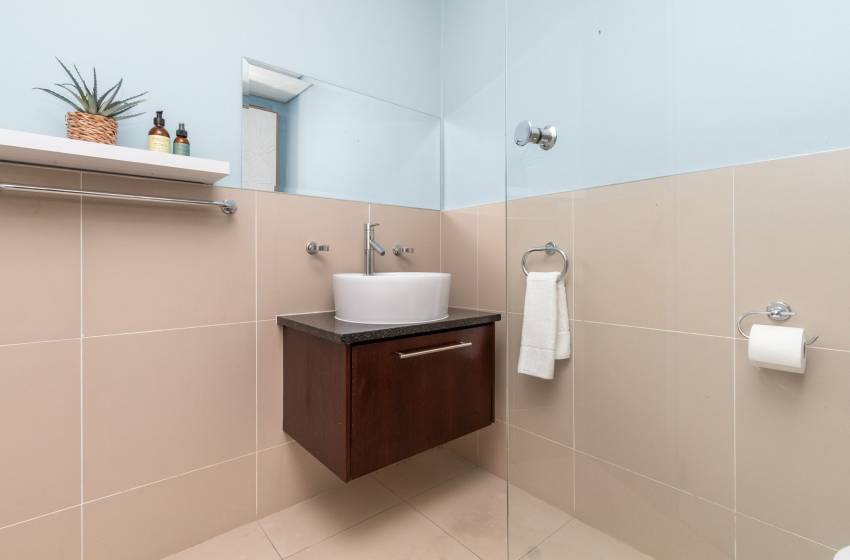 The bedroom is thoughtfully furnished with a queen-size bed with nightstands and a wardrobe, as well as a sliding door opening to a French balcony. The bathroom is fitted with a spacious walk-in shower, a washbasin with vanity and bathroom cabinet, and a toilet. Linen and towels are provided with your stay.