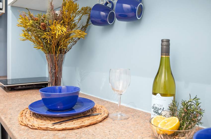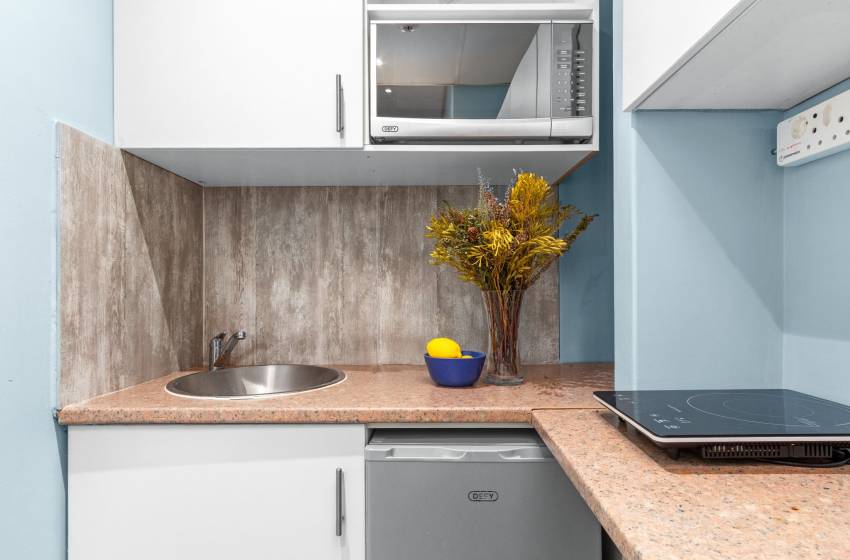 The kitchen is equipped with sufficient storage space with a mini fridge, a microwave, and a single induction cooker for your convenience, ensuring you enjoy a basic self-catering stay. The kitchen counter features barstools, creating an intimate sitting area for two.