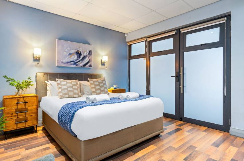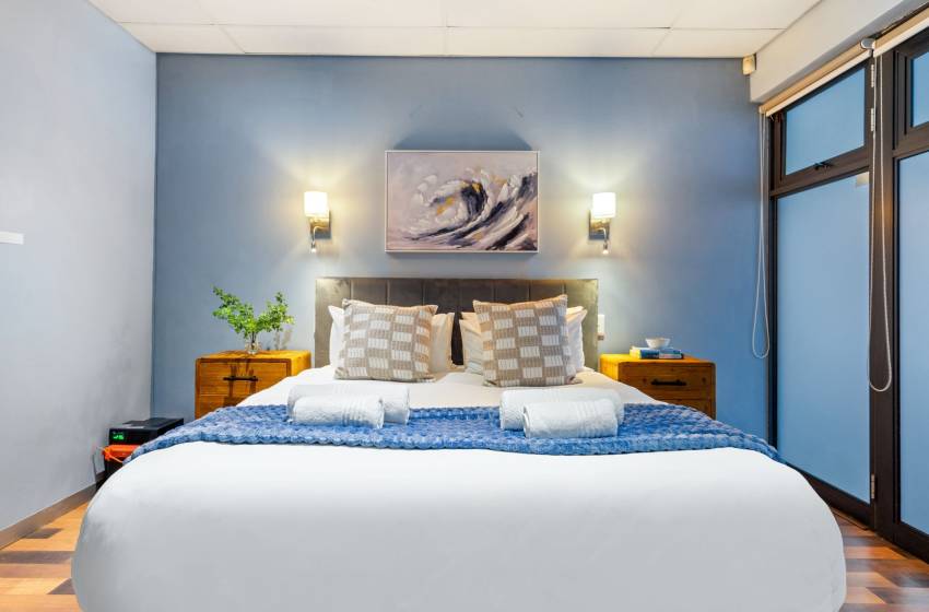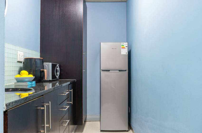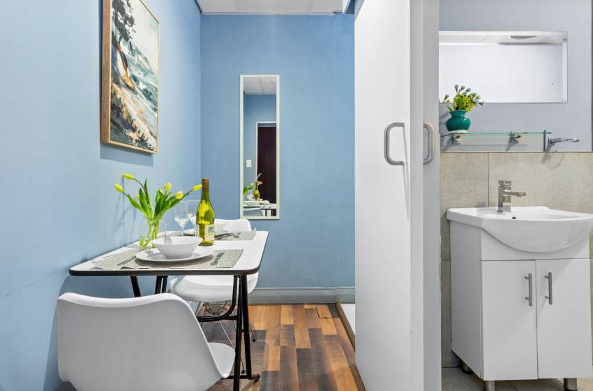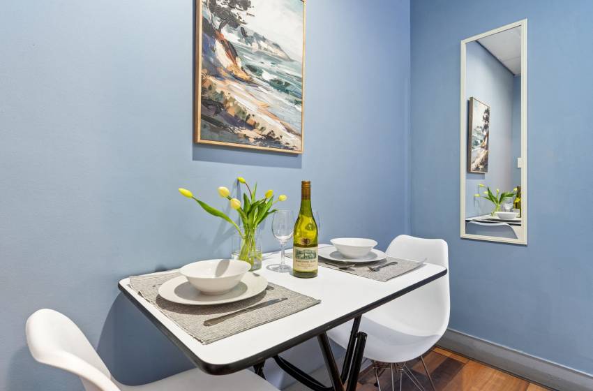 This studio apartment at Eden on the Bay comfortably accommodates up to two guests. As you enter the property, you will find a tastefully furnished kitchen featuring a refrigerator, microwave and kettle and a compact dining that space features a table and seating for two.