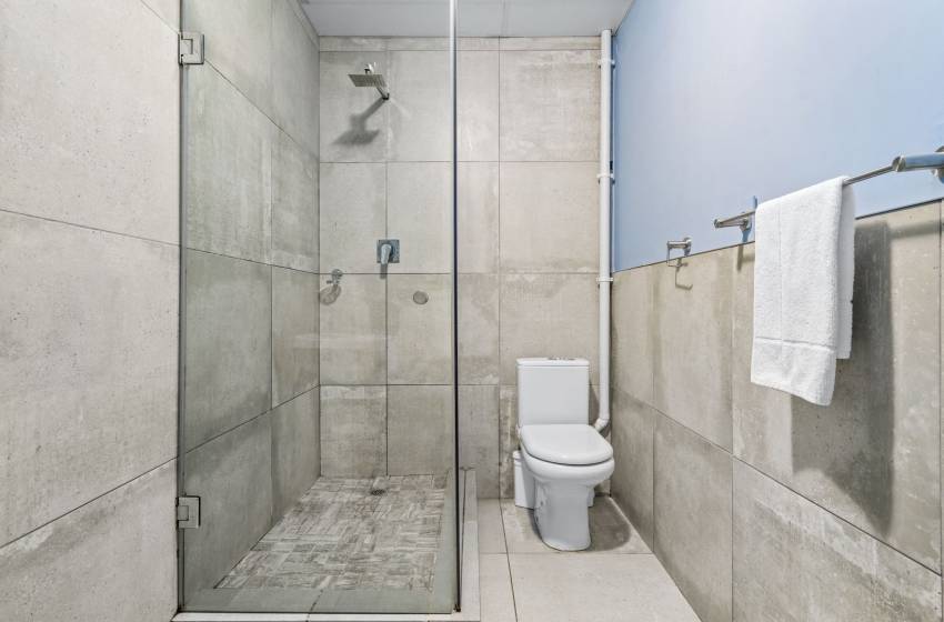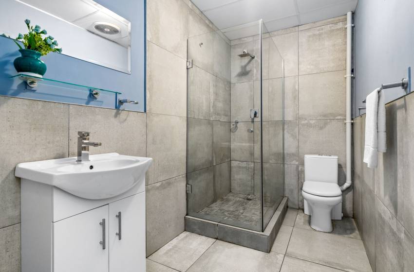 The bedroom is thoughtfully decorated and fitted with a queen-size bed as well as an armchair and a blanket box for added convenience. The bathroom features a washbasin with a cabinet and vanity, as well as a walk-in shower and toilet. Concierge services are available, and linens and towels are included with your stay.