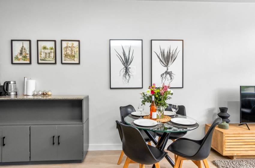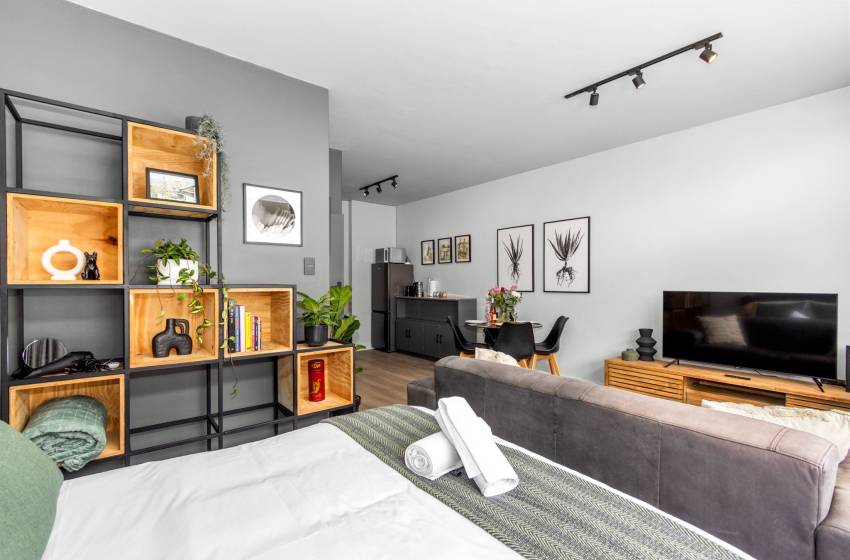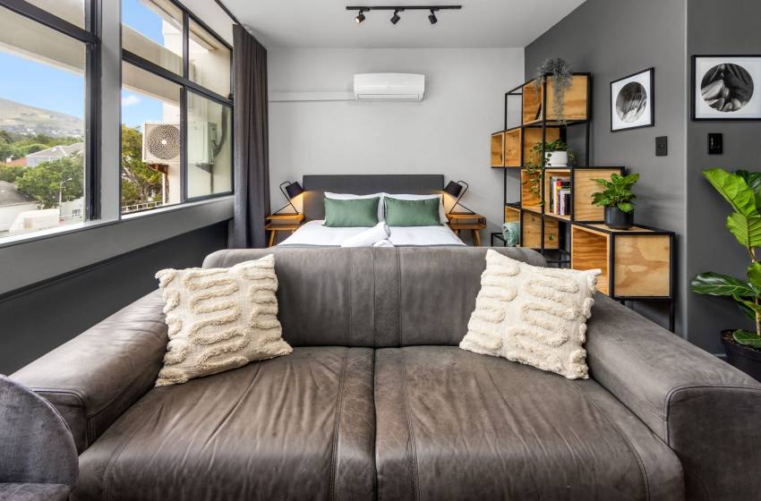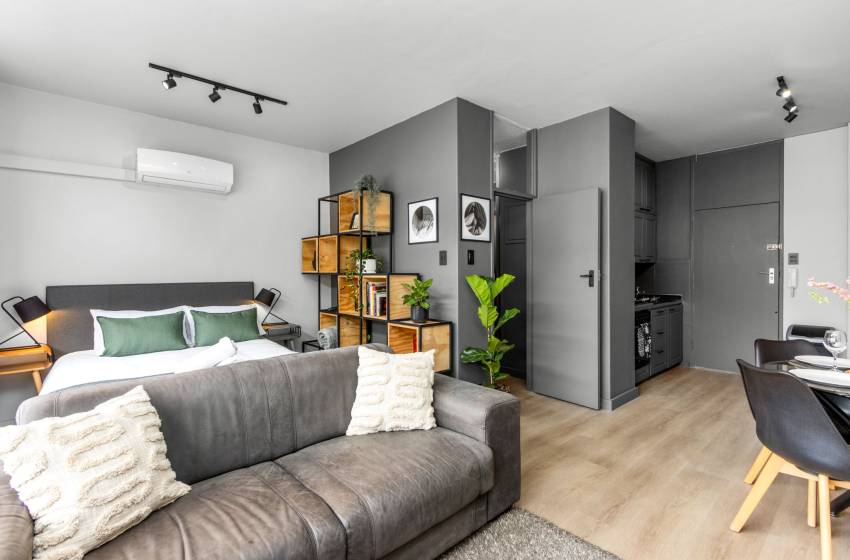 Ideally situated in the mall, Garden Center Studios is within close proximity to, shops, a hair/beauty salon, and doctor’s rooms, a Laundromat opposite the property, popular restaurants, cafes and bars. Iconic destinations like Company’s Garden, Long Street, and the colourful Bo-Kaap neighbourhood are just a short stroll away, or make use of the Mycity bus stop across the road to explore the beautiful mother city, making it the perfect base for discovering the Mother City. Whether you’re here for business or leisure, Studio 107 provides a perfect blend of modern comfort and convenience.