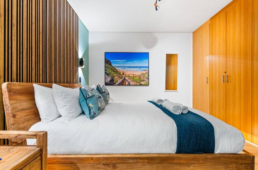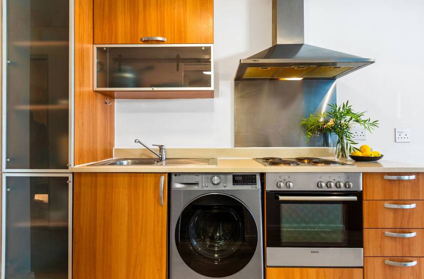 As you enter the apartment, you will be greeted by the stylish open-plan design of the space with a fully equipped kitchen fitted with everything you need to enjoy a comfortable self-catering experience, with a coffee nook and a coffee machine, as well as a front-loading washing machine for added convenience.