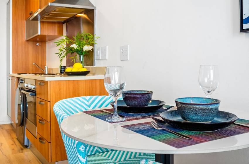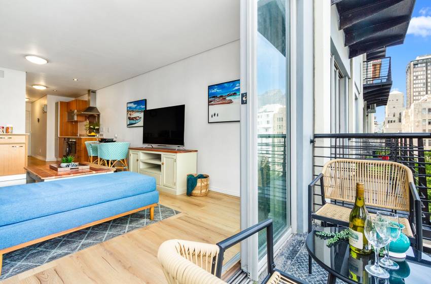 The dining space features a sleek round dining table with comfy seating for two, while the lounge is thoughtfully furnished with a L-shaped sofa, a coffee table, and a TV cabinet housing a flatscreen television, creating the perfect spot for entertaining. Sliding doors open onto the balcony overlooking the lively Greenmarket Square with outdoor furniture creating an intimate sitting area to enjoy a lovely cup of coffee.