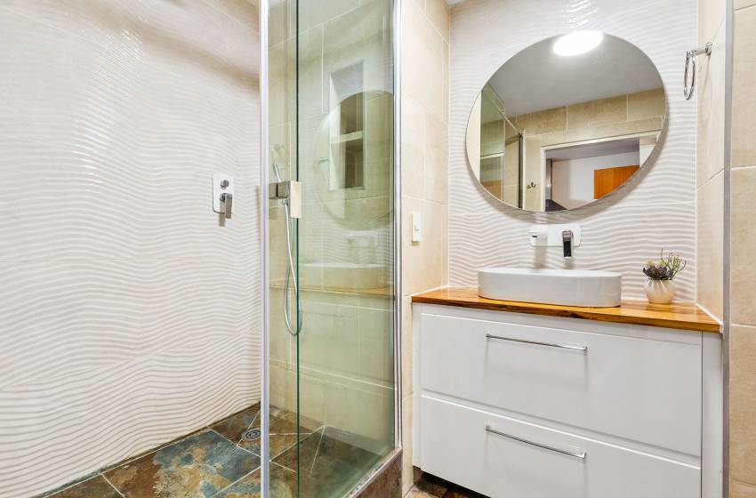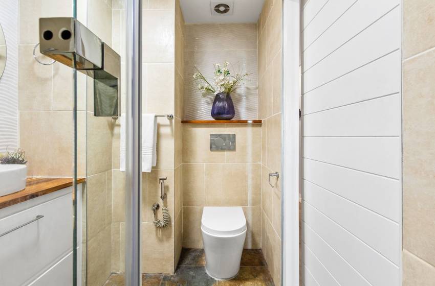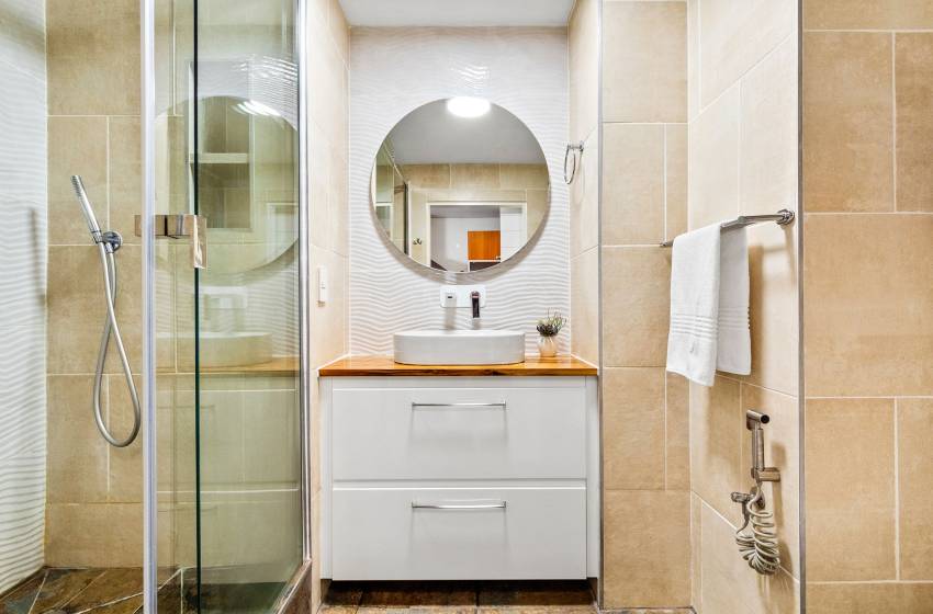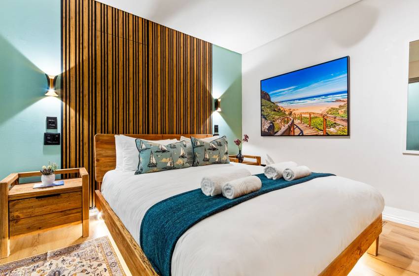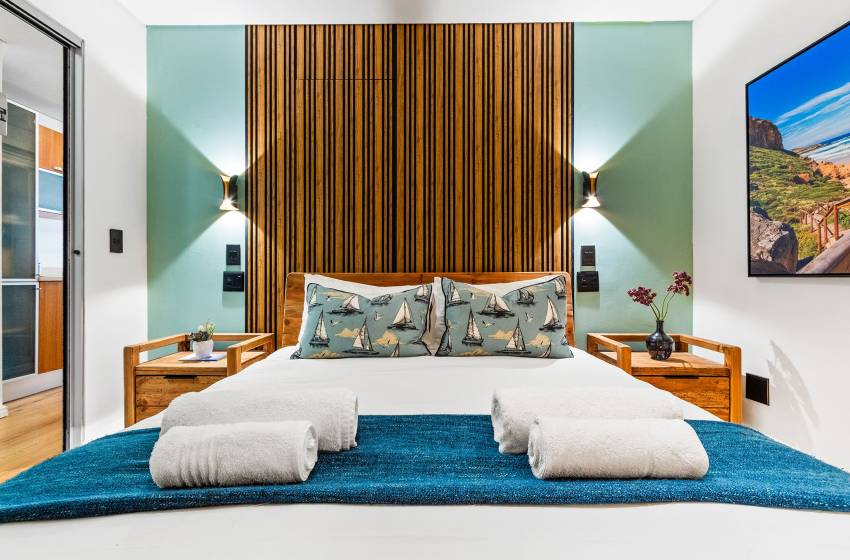 The bedroom is furnished with a queen-sized bed with nightstands on either side and a spacious wardrobe. The property also includes a portable air conditioner and a fan for the hotter days in Cape Town. The bathroom features a spacious shower, a washbasin with a vanity and cabinet, and a toilet equipped with a handheld bidet sprayer. Fresh linen and towels are included with your stay.