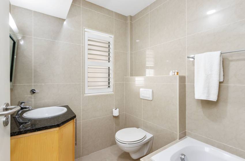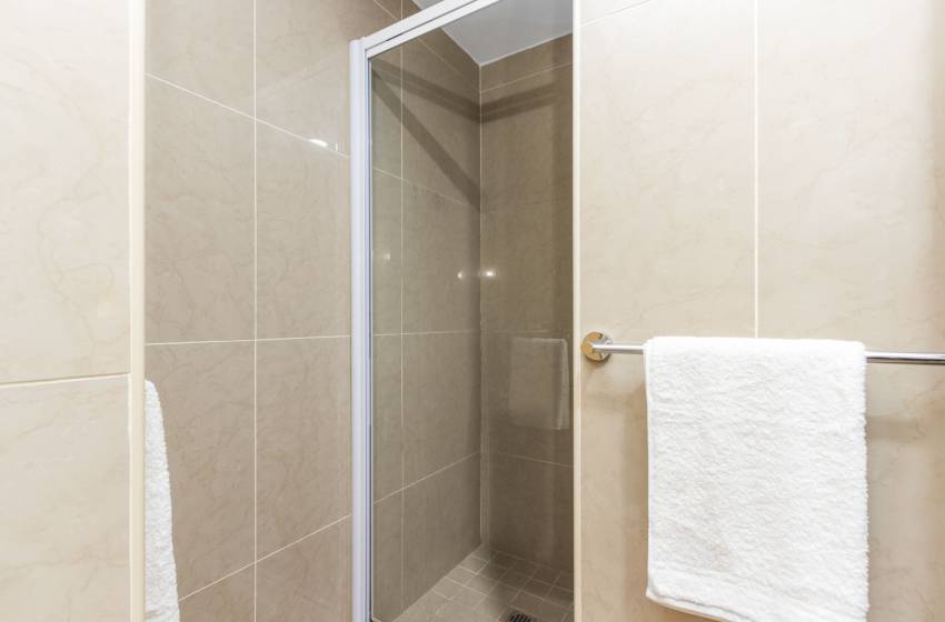 The well appointed bedrooms ensure to provide a well deserved peaceful nights rest. The main bedroom offers a queen size bed, access to the patio as well as an en-suite bathroom with a shower while the second bedroom offers a double bed and utilizes a shared bathroom with a bath.