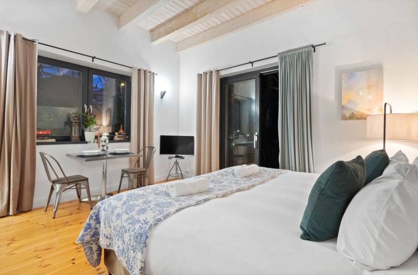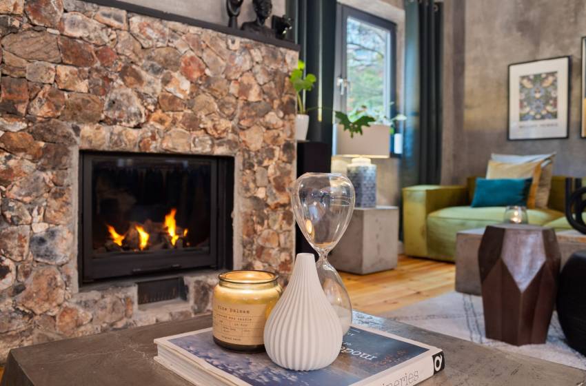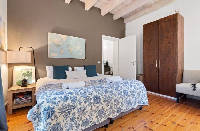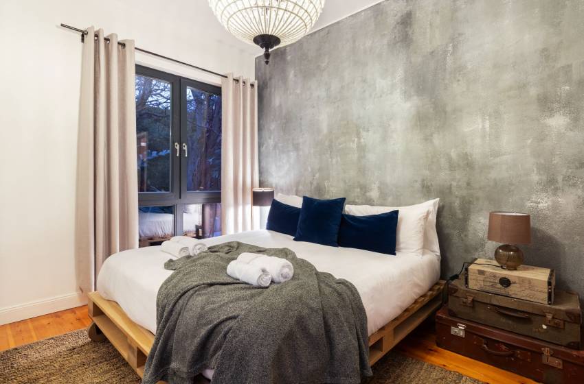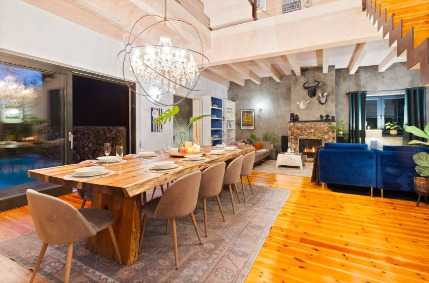 Upon entering the villa, be welcomed by its rustic charm and striking double-volume, open-plan layout. The stylish kitchen takes centre stage with a generous countertop and is fully equipped for a seamless self-catering experience including a dishwasher for effortless clean-up. The adjacent dining area features a robust wooden table that comfortably seats ten, making it ideal for shared meals and memorable gatherings. Just beyond, the beautifully curated lounge invites relaxation with its cosy furnishings, indoor fireplace, and flat-screen TV offering the perfect setting to unwind, whether you're curling up by the fire or enjoying a quiet evening in.