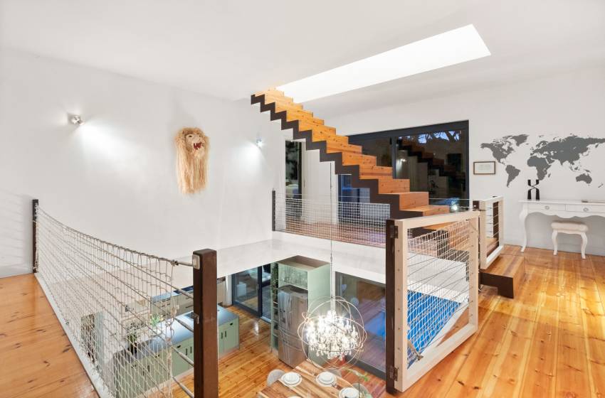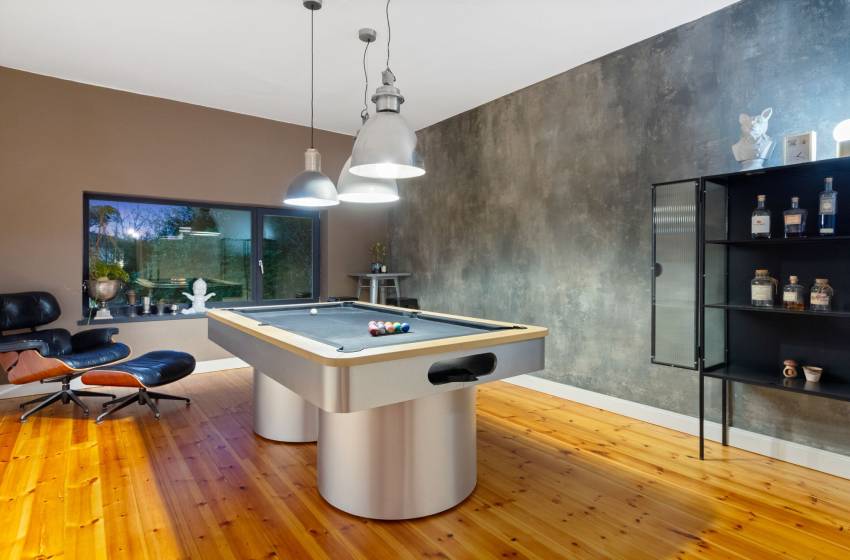 This exceptional villa offers a variety of leisure and entertainment spaces across three levels. On the first floor, guests can enjoy a chic games room with a pool table, a conveniently located guest toilet, and seamless access to a patio featuring plush seating, a private pool, and a braai area perfect for alfresco gatherings. The lower basement level reveals a character-rich vintage wine cellar with additional storage, while the second floor boasts an elegant guest lounge and direct access to a rooftop terrace, offering breathtaking views and the ultimate setting for relaxation.
