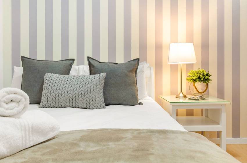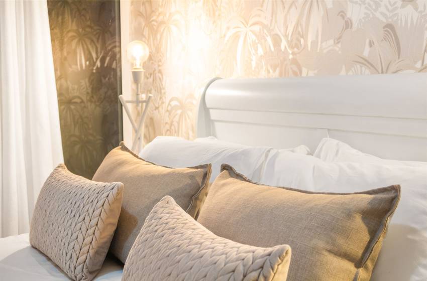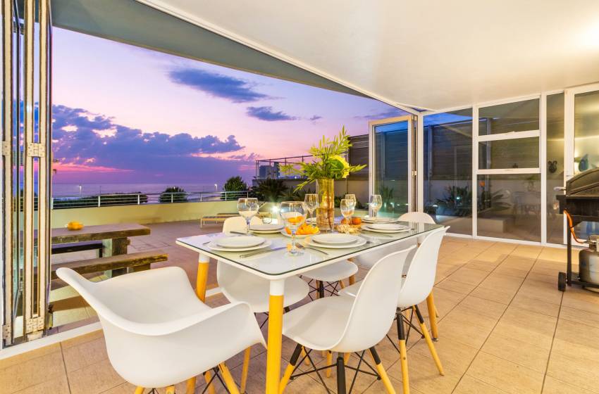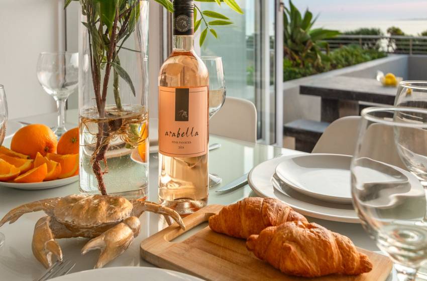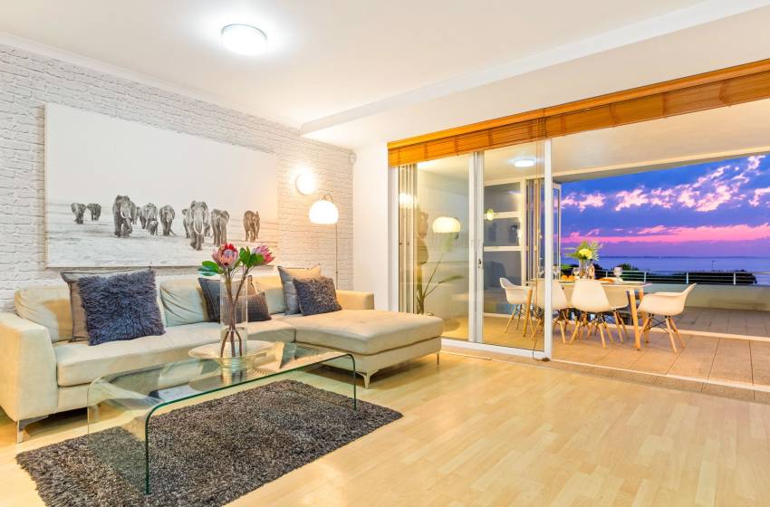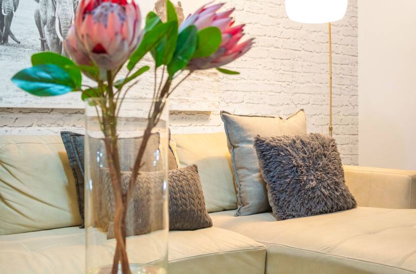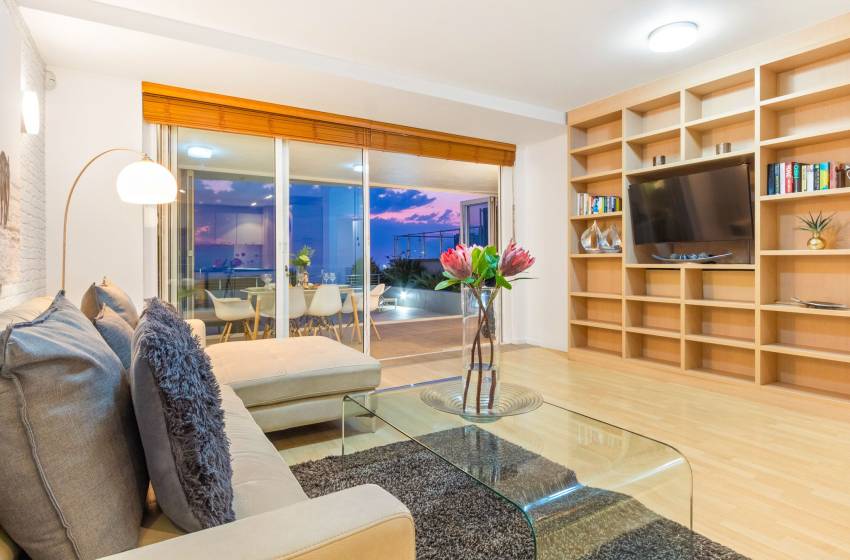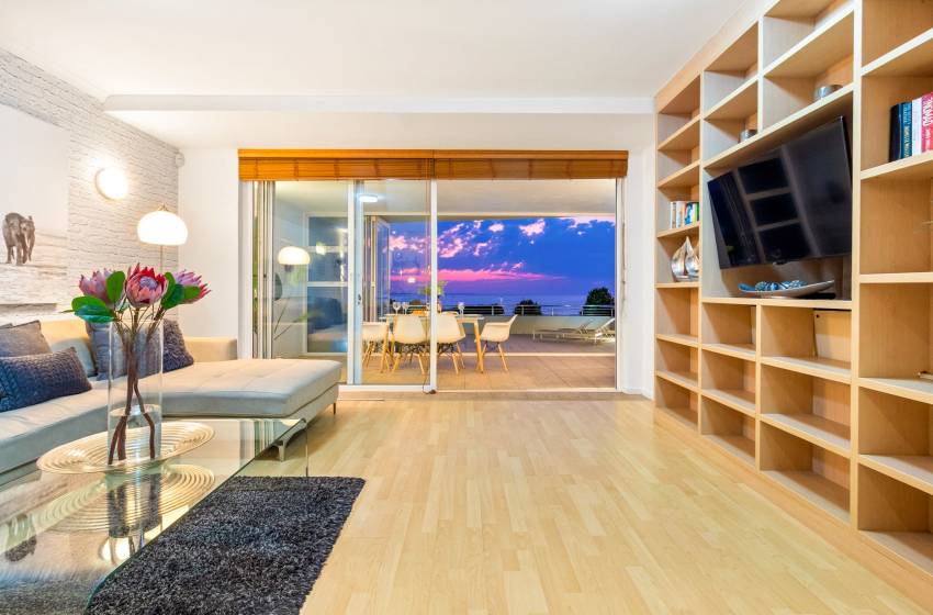 The main living area has a rustic elegance thanks to the large white face brick wall lining one side. The apartment has an open-plan fully-equipped kitchen and spacious lounge in soothing natural tones with a flat-screen TV and DSTV. The main living area leads to a sun lounge with a 4-seater dining table. Glass stacking doors that open fully lead onto the large private balcony with loungers, a casual dining area and exceptional ocean views - perfect for entertaining or simply enjoying a Cape Town sunset.