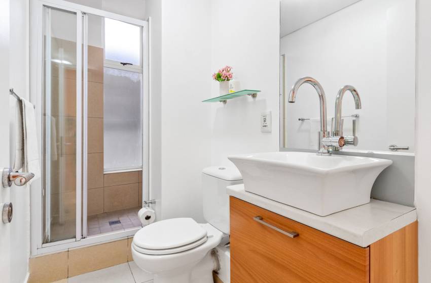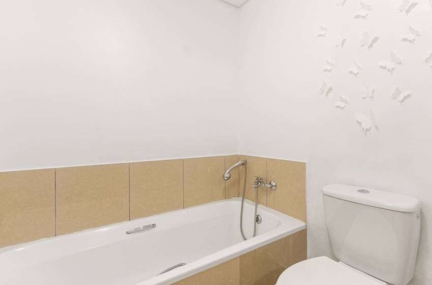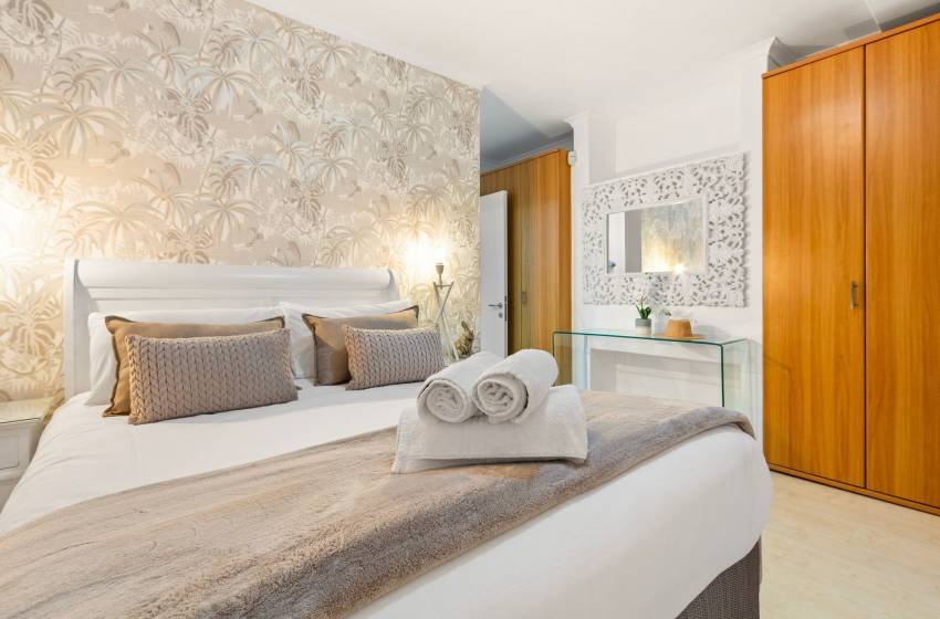 The main bedroom has a double bed, an en-suite bathroom with a bathtub, and balcony access. The second bedroom has a double bed and access to the shared bathroom featuring a shower. Additional amenities of the apartment include WiFi, barbecue facilities, a swimming pool, secure parking in a bay, and 24-hour security.