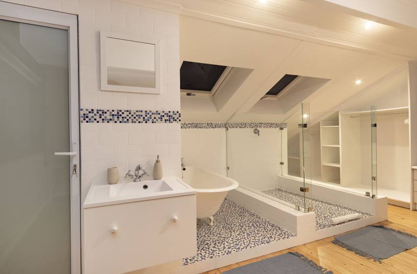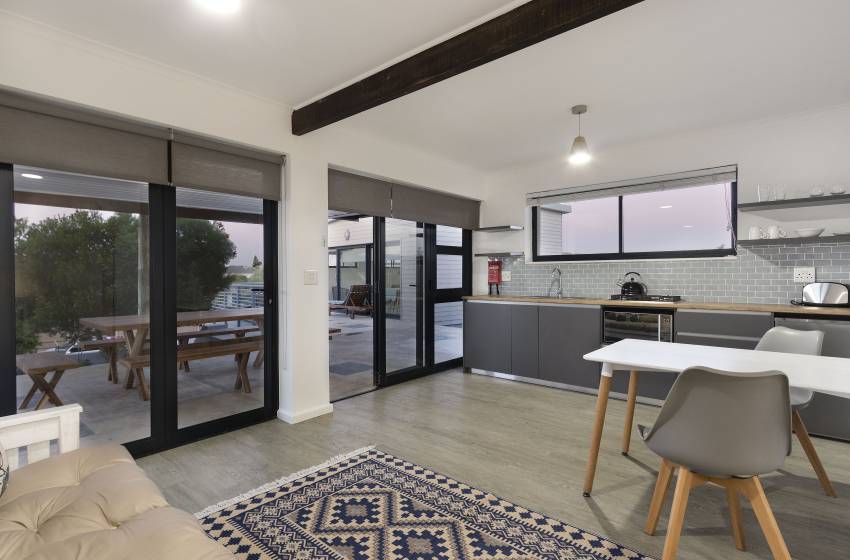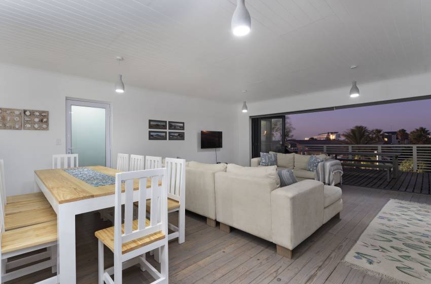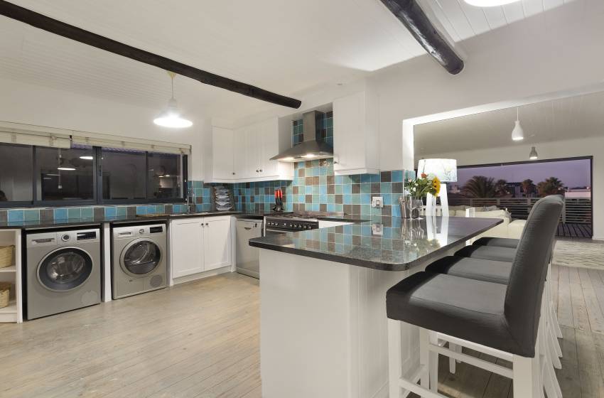 The living area on the first floor boasts a fully equipped kitchen, including a dishwasher, washing machine and a tumble dryer. A spacious open plan dining/living room are fitted with stacking doors that open onto a deck, where one can take in the fresh ocean air. A Smart TV and fibre internet are accessible from these areas as well. A comfortable game/reading room, with sliding doors onto a deck, is available for all guests seeking entertainment space or some peaceful time away.