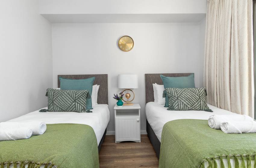 The main bedroom features a queen-sized bed with nightstands on either side, an en-suite bathroom, and a large window showcasing spectacular views of your surroundings and towering palm trees. The en-suite bathroom is fitted with a washbasin with vanity, a shower, and a toilet. The second bedroom features two single beds, a shared nightstand, and access to a private balcony. The shared bathroom features a washbasin with vanity, a bathtub, a toilet, and a tumble dryer. Linen and towels are provided with your stay.