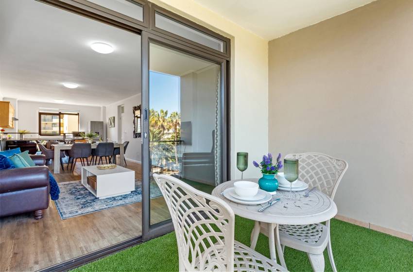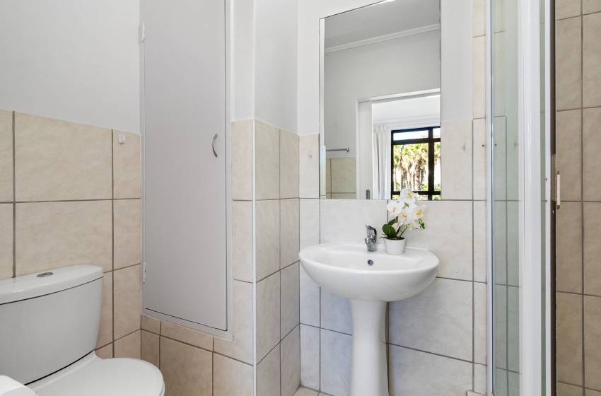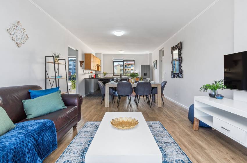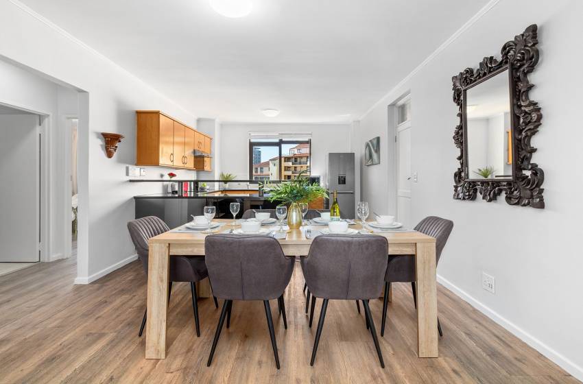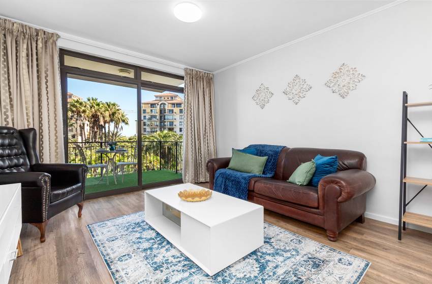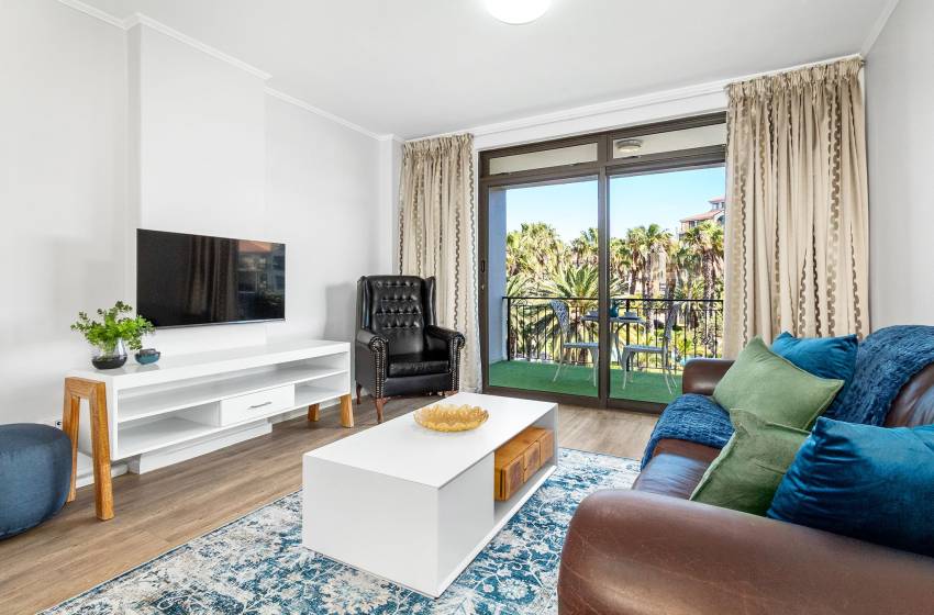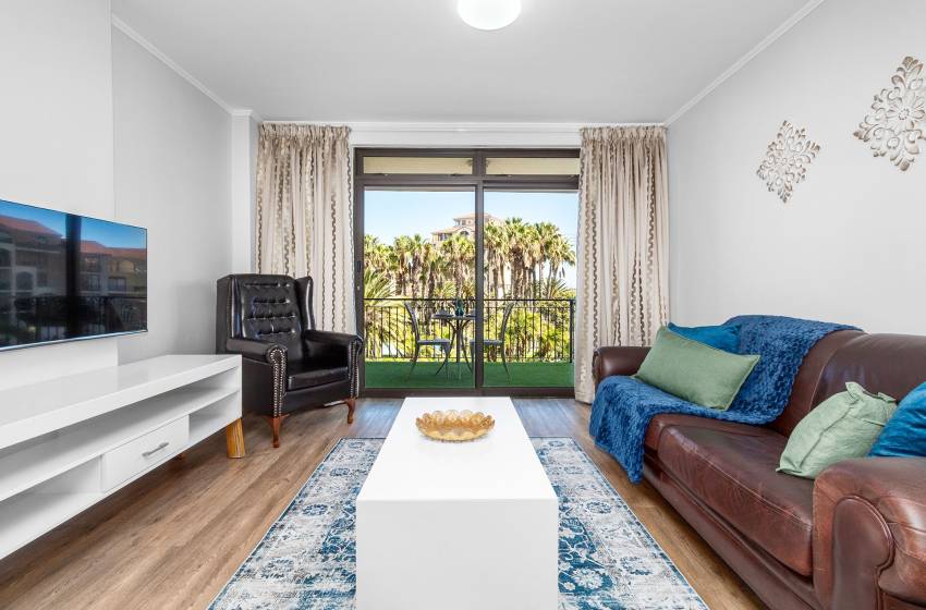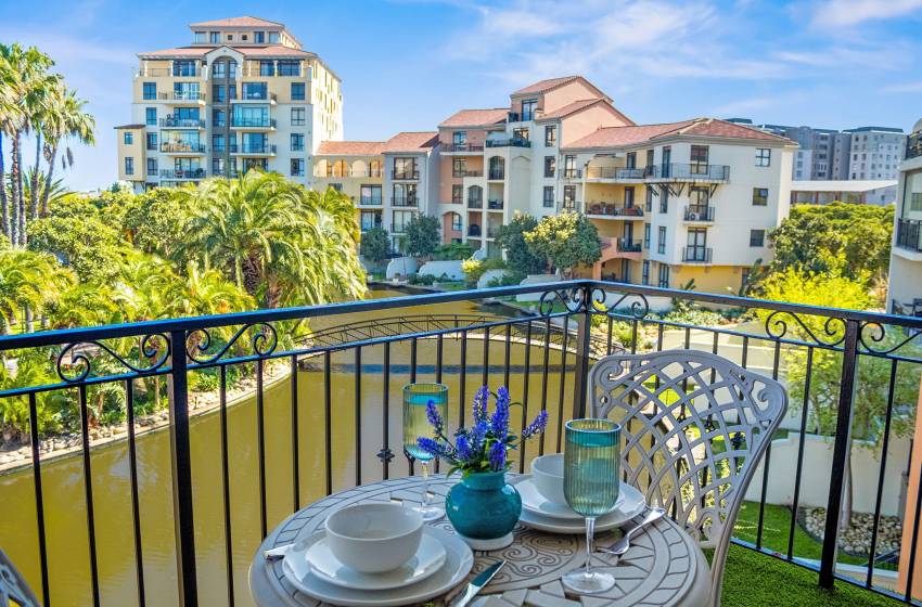 Adjacent to the kitchen, you will find the dining space thoughtfully furnished with a large wooden dining room table with comfy seating for up to six guests. The living room is furnished with a classic two-seater leather sofa, a single leather armchair, and a sleek coffee table, as well as a TV cabinet that houses a flat-screen television. Guests will enjoy internet access throughout the property. The apartment boasts a prime position in the heart of the Canal Walk precinct, with glass sliding doors opening to the balcony, with an outdoor dining set fit for two, overlooking the Grand Canal.