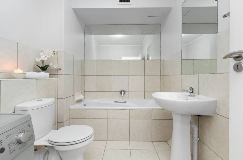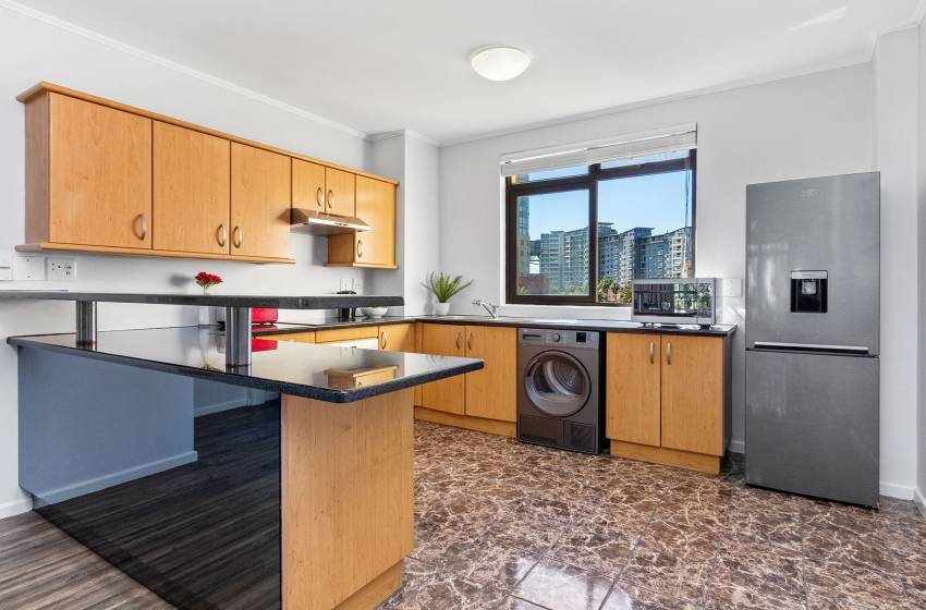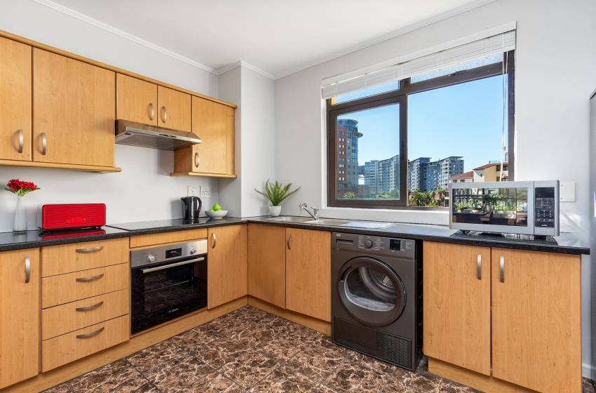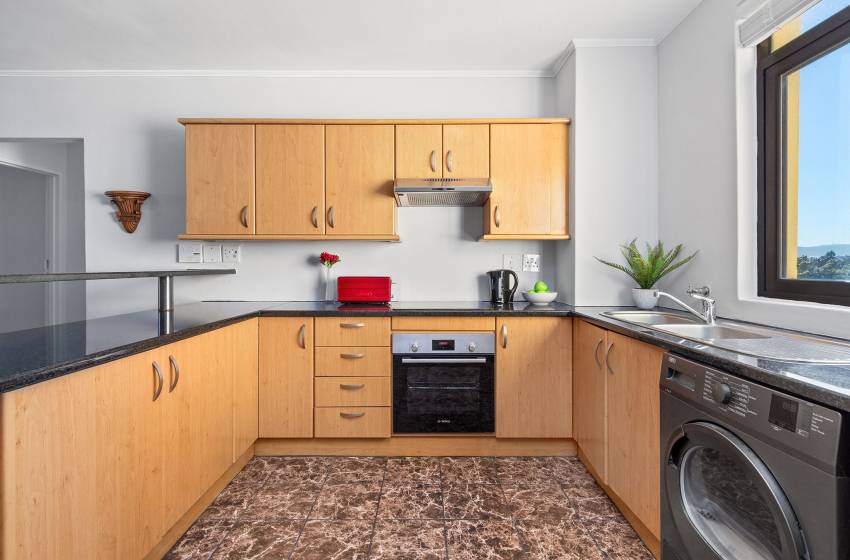 As you enter the property, you will be greeted by the spacious open-plan design of the living space. The kitchen features a large window boasting spectacular views of the city, ample countertop and cupboard space, and is fully equipped with everything you need to enjoy a comfortable self-catering experience, including a front-loading washing machine for added convenience.