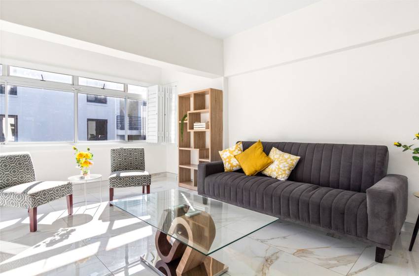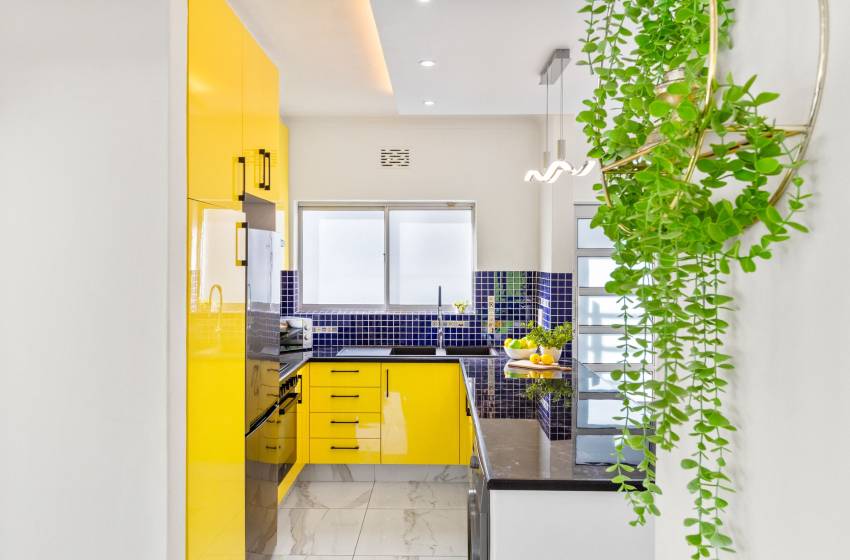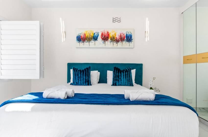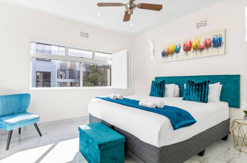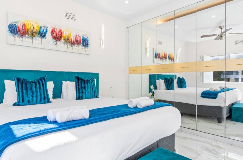 The apartment has spectacular views of Table Mountain and Lions Head and a limited view of the harbour. The apartment is fitted with an inverter to ensure uninterrupted WiFi and consists of an open plan main living area consisting of a dining area and lounge with air-conditioning to combat the summer heat. The kitchen is separate from the lounge area and features every amenity necessary to ensure effortless self-catering, including a dishwasher and washing machine for guests’ convenience. Crisp white walls, high ceilings, and ample natural light add something special to the lounge area, creating an airy and spacious environment to relax in while enjoying your favourite series on the wall-mounted flat-screen TV with Open View and Netflix.