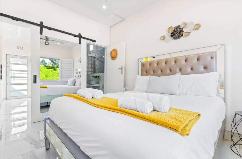 There are two bedrooms, one with an extra length king bed and the other with a queen. The master bedroom has a beautiful en-suite bathroom boasting marbled countertops and a shower, while the second bedroom has access to the shared bathroom.