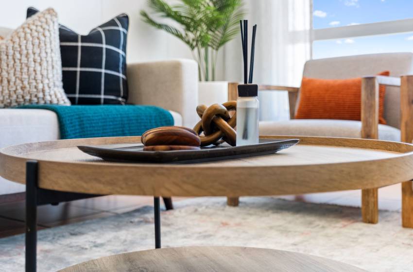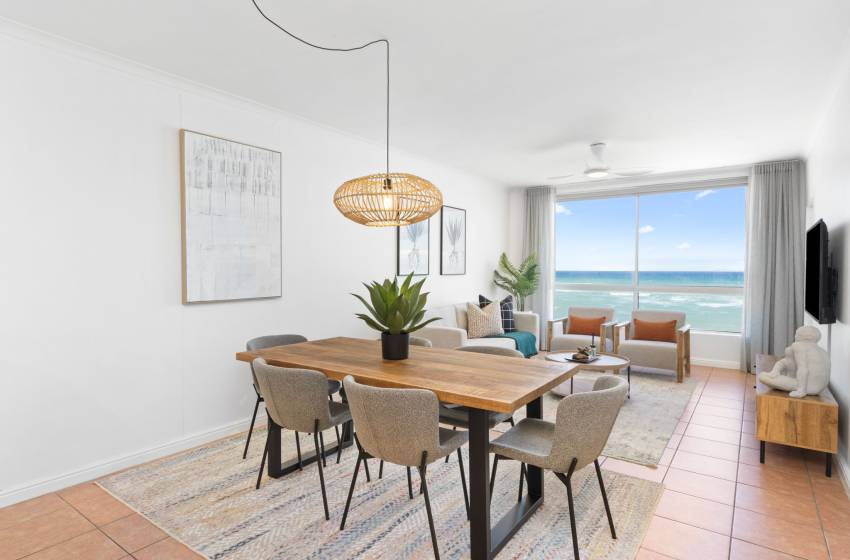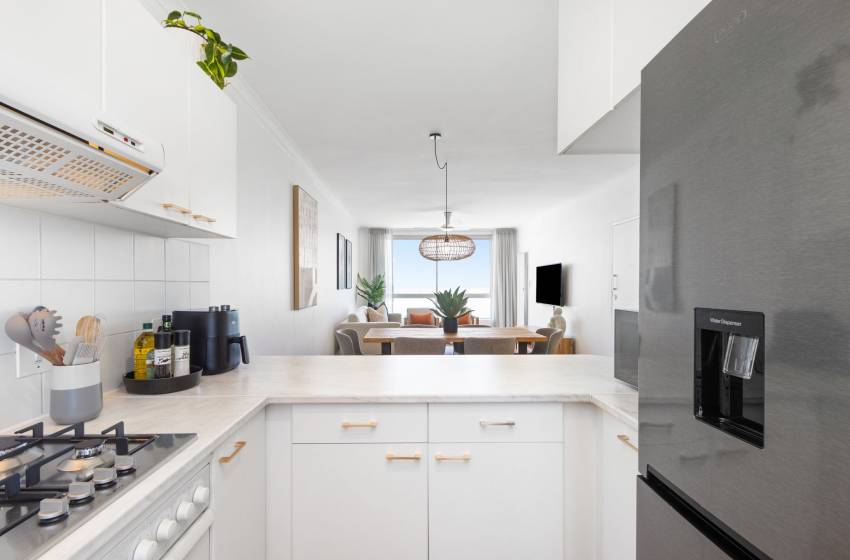 The kitchen flows seamlessly into the elegant living space, where you’ll find a cozy dining area, plush lounge seating, and a flat-screen TV. Expansive floor-to-ceiling windows not only frame spectacular mountain and ocean views but also bathe the apartment in natural light and invite the refreshing coastal breeze indoors—creating a serene ambience for relaxation.