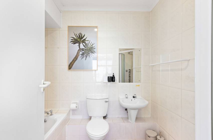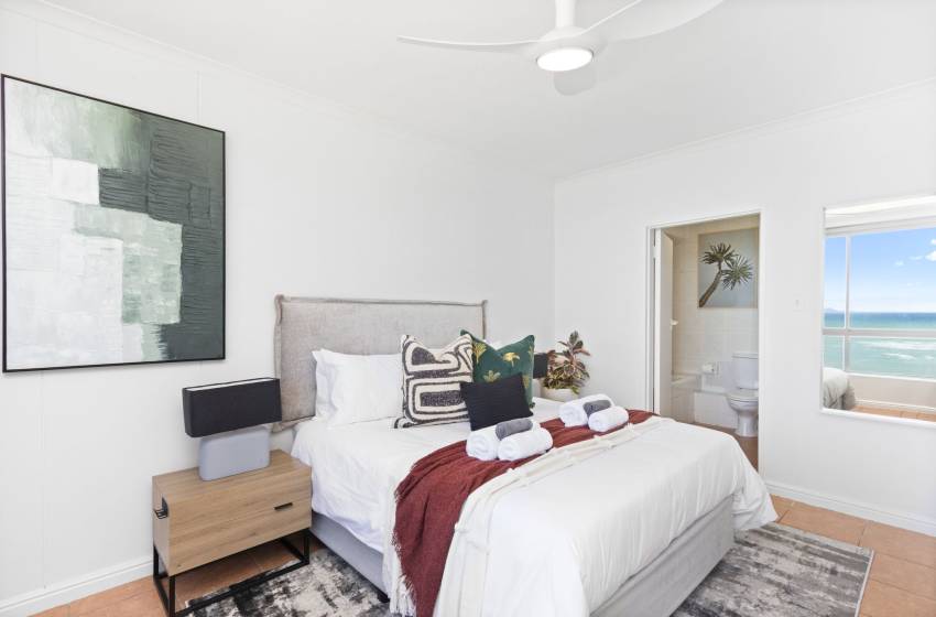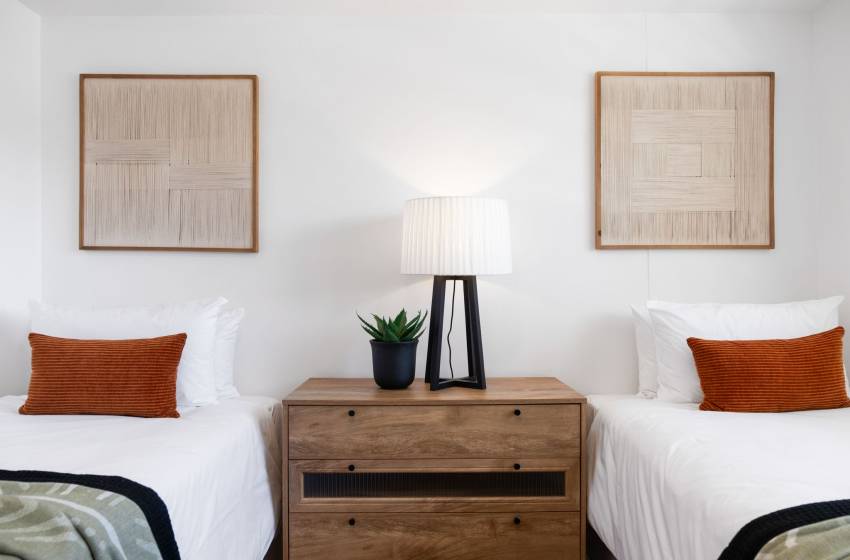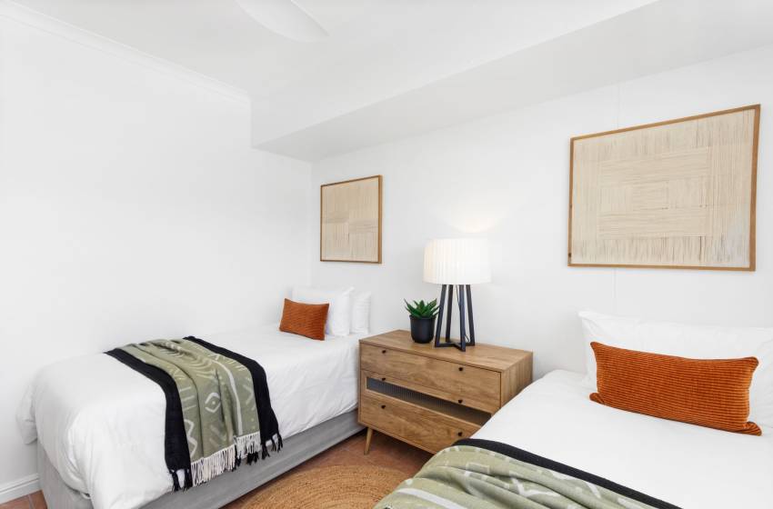 The master bedroom offers a tranquil retreat with a queen-sized bed and an en-suite bathroom that includes a bath, shower, toilet, and basin. The second bedroom, furnished with two single beds, has access to a shared bathroom featuring a shower, basin, and toilet.